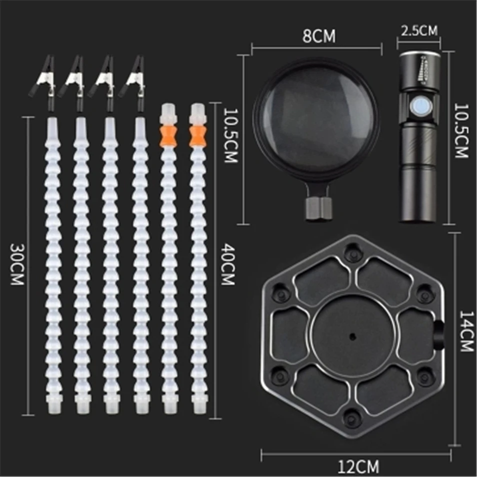 2.Flexible arms each with 4 x large swiveling alligator clips, 1 x 3X-5X magnifying glass, 1 x 1X-4X zoom USB rechargeable flashlight, clip / magnifying glass / flashlight can be removed.