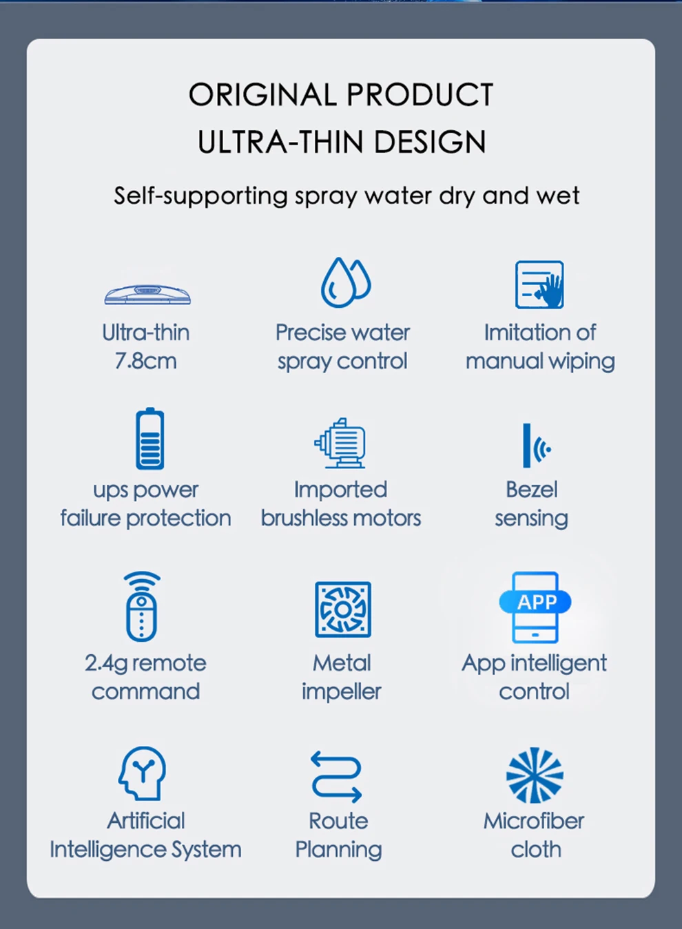 (Ультра-тонкий 7,8 см/точного распыления воды/имитацией ручной протирание/UPS защита от отключения питания/импортируется из бесщеточные двигатели/ободок зондирования/2,4G удаленных команд/металлическое Насосное колесо, литое по выплавляемой модели/приложение интеллигентая (ый) управления/Система искусственного интеллекта/Планирование маршрута/ткань из микрофибры)