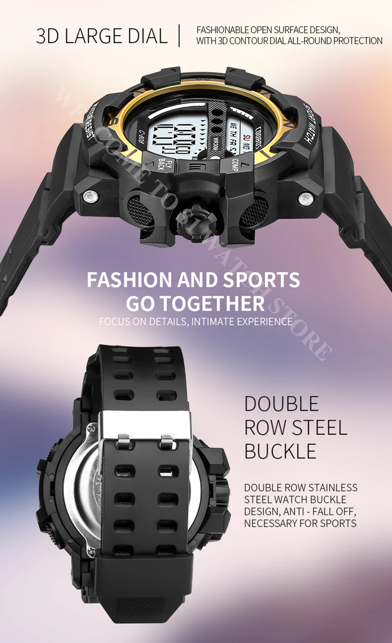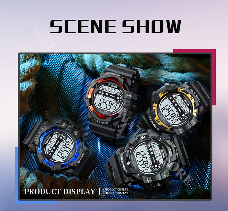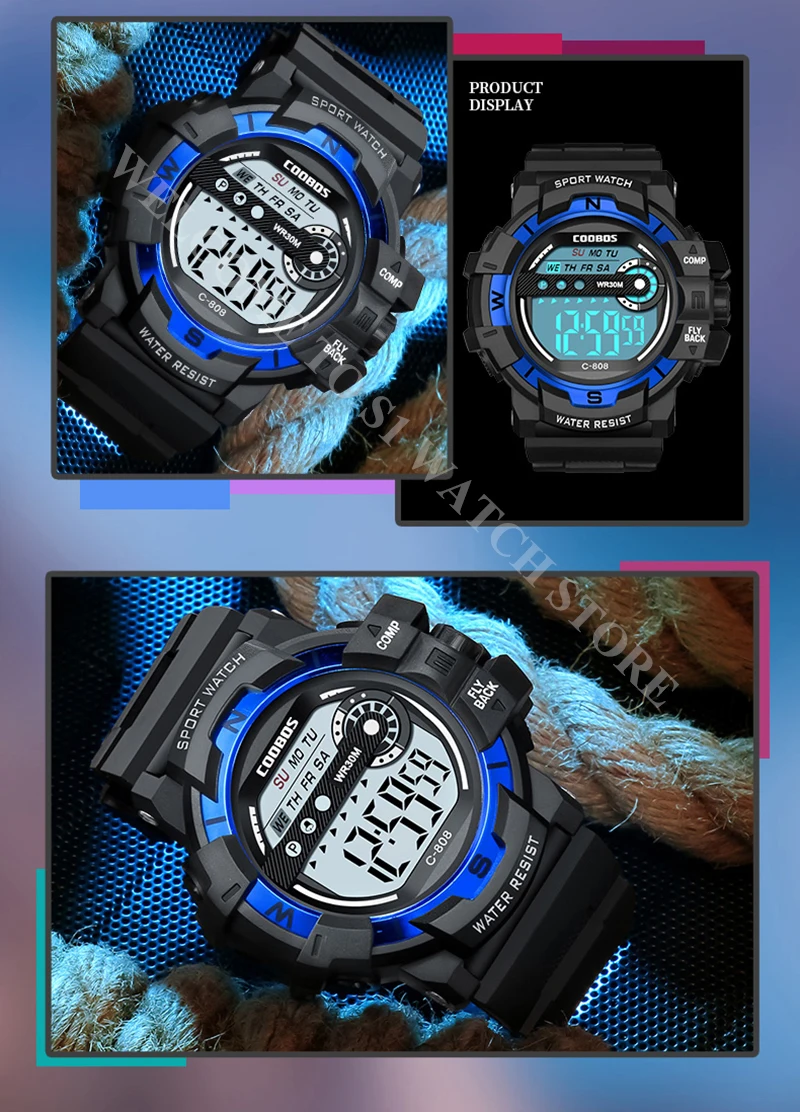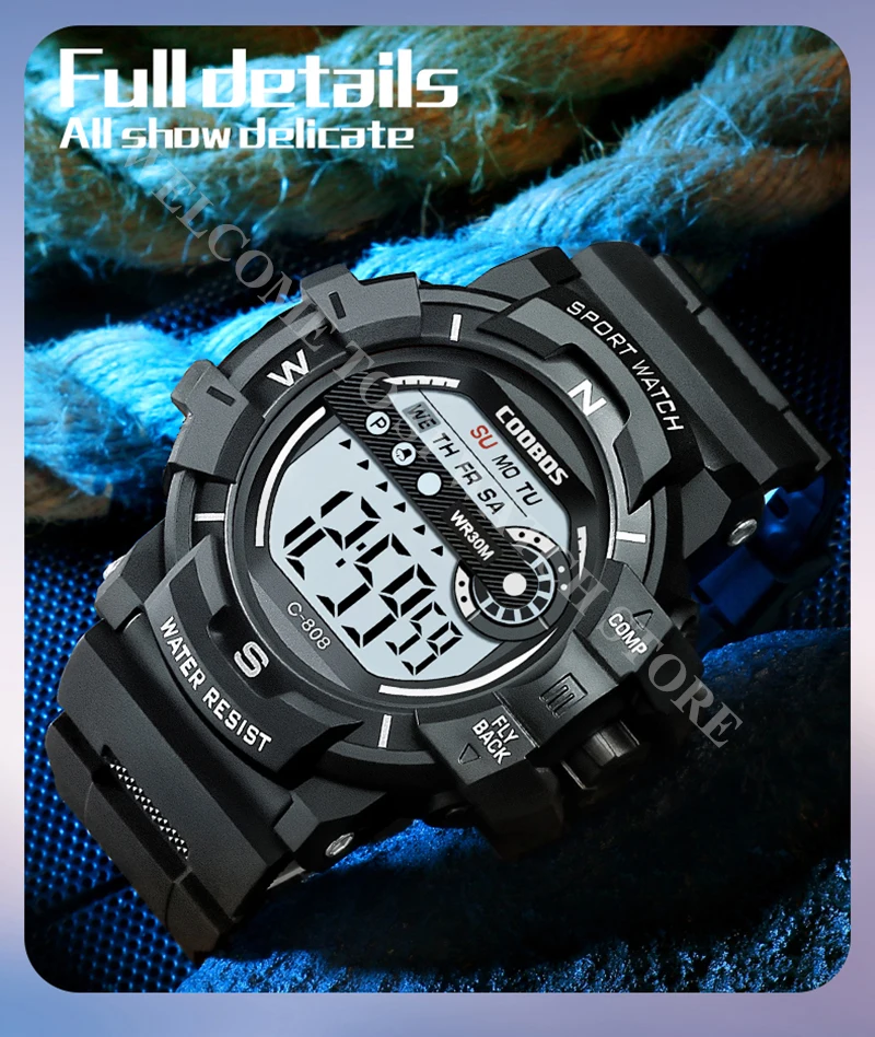Характеристики: секундомер/задний светильник/ударопрочный/светодиодный дисплей/светящийся/Полный календарь/водостойкий/недельный дисплей