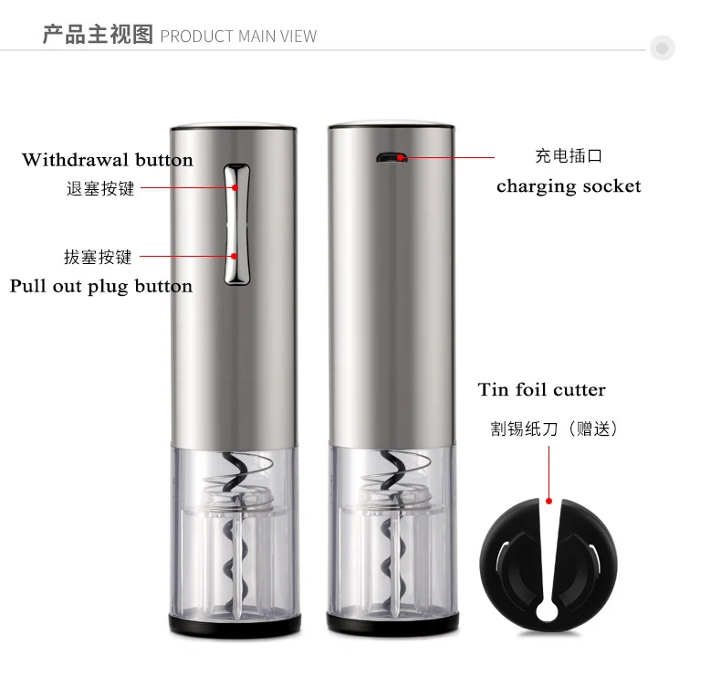 Упаковка: открывалка для бутылок + нож для оловянной фольги + usb-кабель для зарядки + руководство по эксплуатации