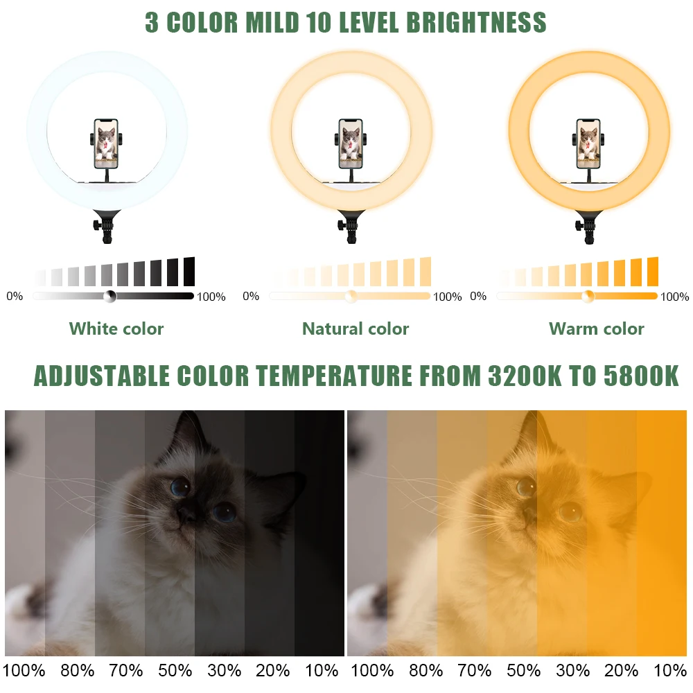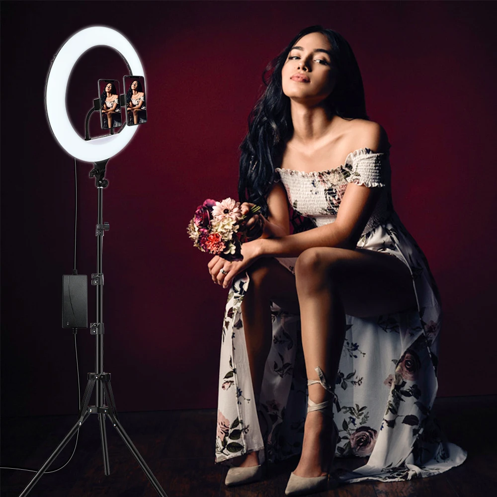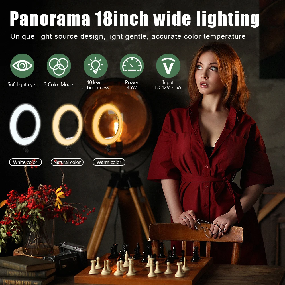 18 дюймовый Диммируемый кольцевой светильник с 3 вида цветов светильник ing режимов и 10 уровней яркости есть высокое качество светодиодный лампы, которые обеспечивают мягкое и непрерывного светильник ing без создания тени на вашем лице. Идеально подходит для прямой трансляции, селфи-фотографии, видео YouTube/TikTok, видеосъемки и блогов.