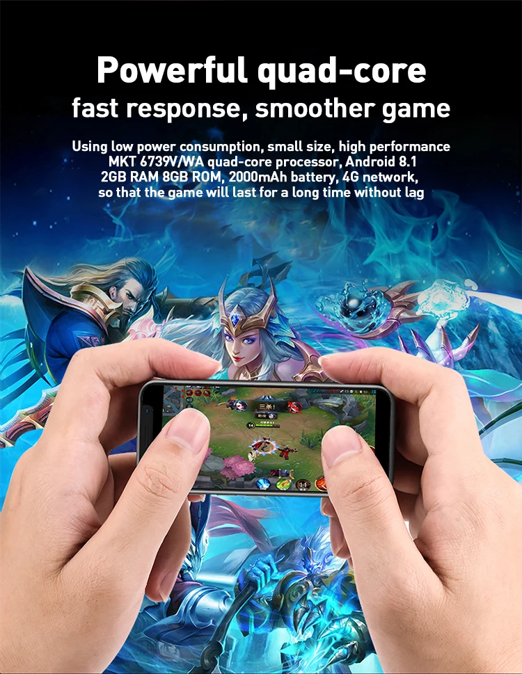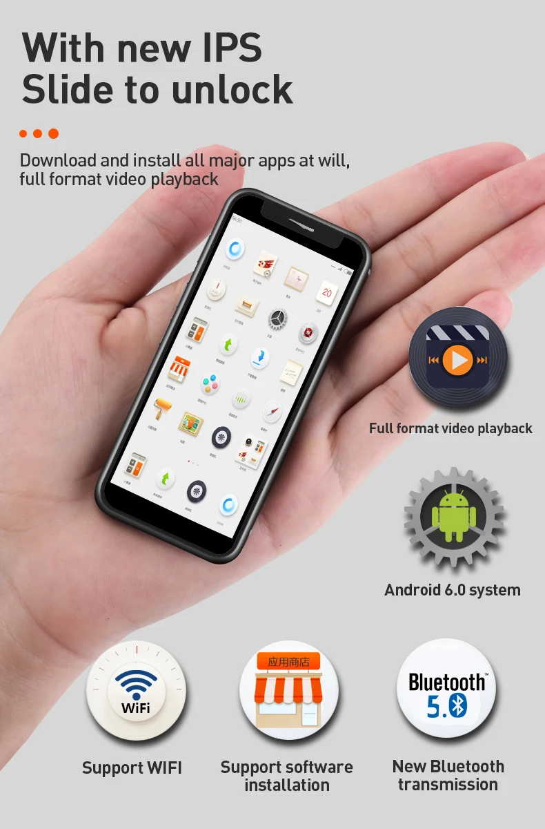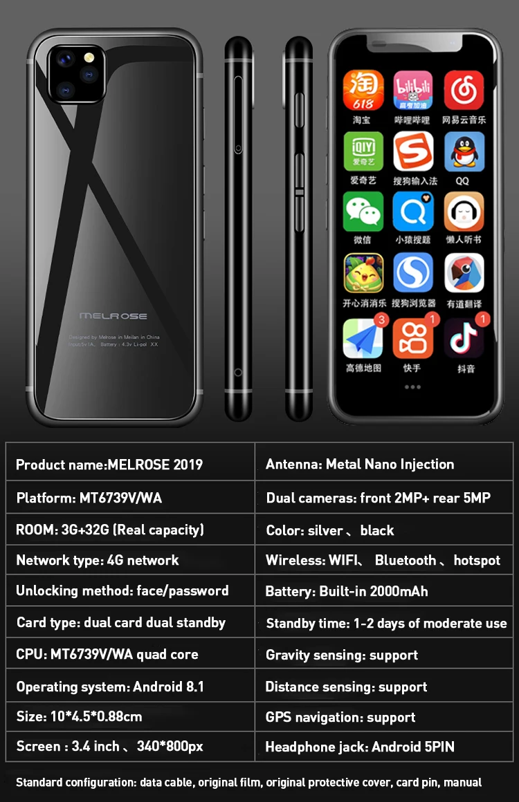 UNIWA Melrose 2019 3,4 "мини-смартфоны Android 8,1 четырехъядерный мобильный телефон двойной 4G LTE мобильный телефон Al распознавание лица 5MP камера Группа 2G 900/1800/850/1900 3G B1/ B8 4G B1/B3/B7/B8/B38/B39/B40/B41