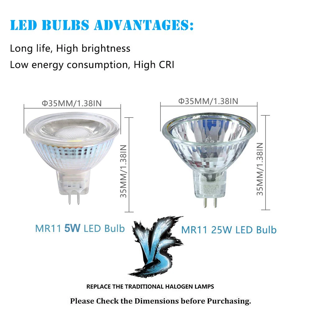 * Стандартная Контактная база MR11. Установите эти лампы во все базовые светильники MR11 напрямую. В отличие от люминесцентных ламп, эти лампы свободны от гудения, мерцания, УФ и ртути.