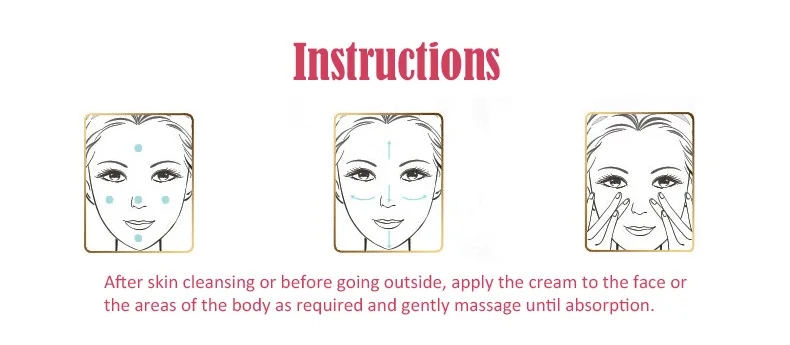 ▶После очищения кожи или перед выходом на улицу нанесите крем на лицо или области тела по мере необходимости и Аккуратно помассируйте до впитывания.