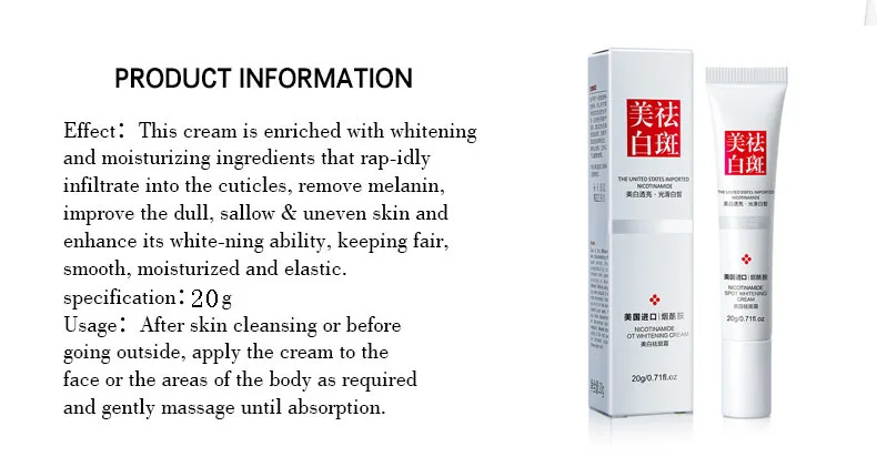 ▶Эффект: этот крем обогатен отбеливающими и увлажняющими ингредиентами, которые быстро проникают в кутикулу, удаляют меланин, улучшают тусклую, желтоватую и неровную кожу и повышают ее отбеливающие способности, сохраняя белую, гладкую, увлажненной и эластичные.