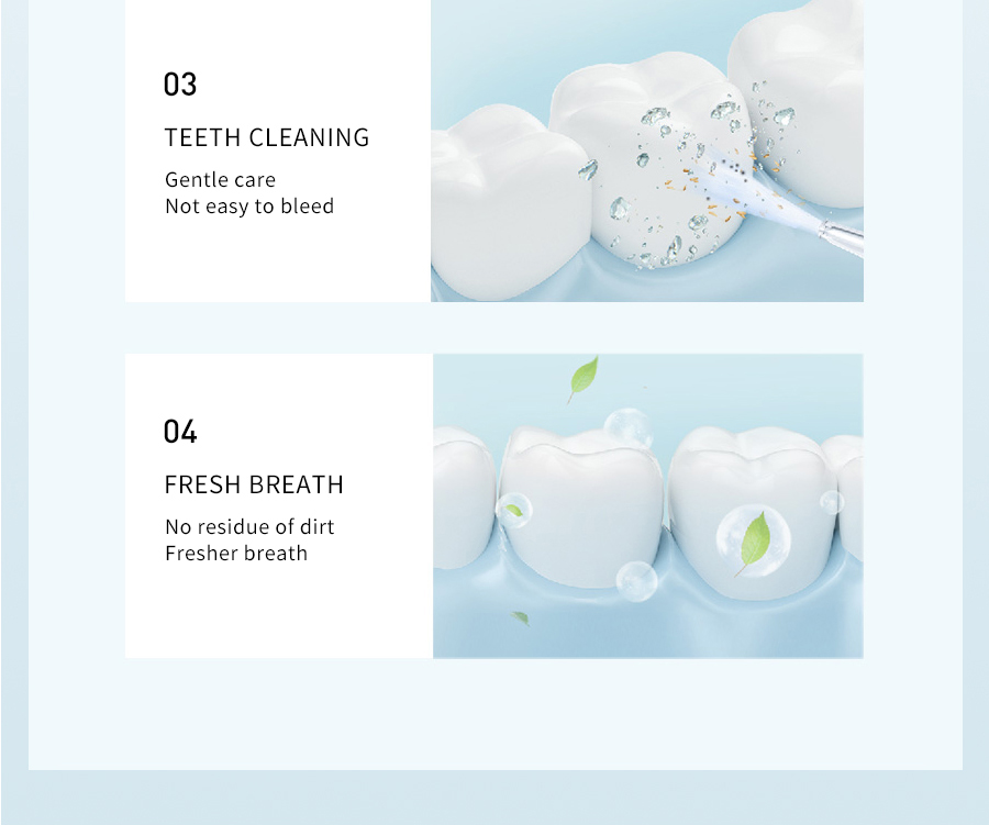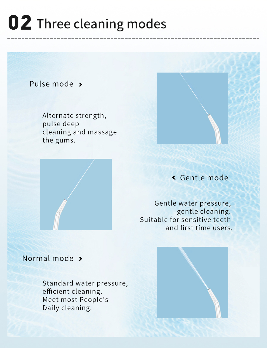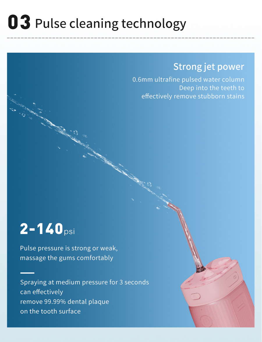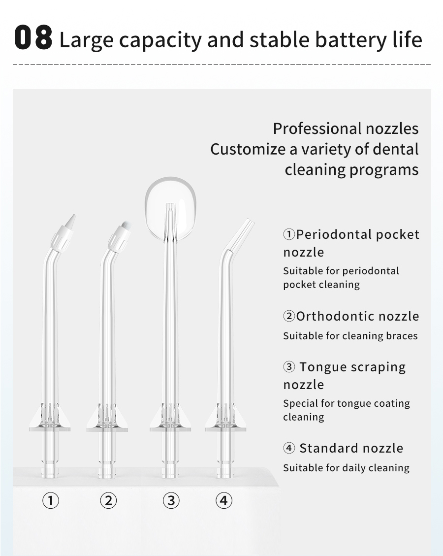 • 【 3 режима & amp; 4 nozzles】выберите «нормальный» для мощного удаления частиц пищи, «мягкий» для нежной очистки чувствительных зубов, «Пульс» для массажа десен и ополаскивания.