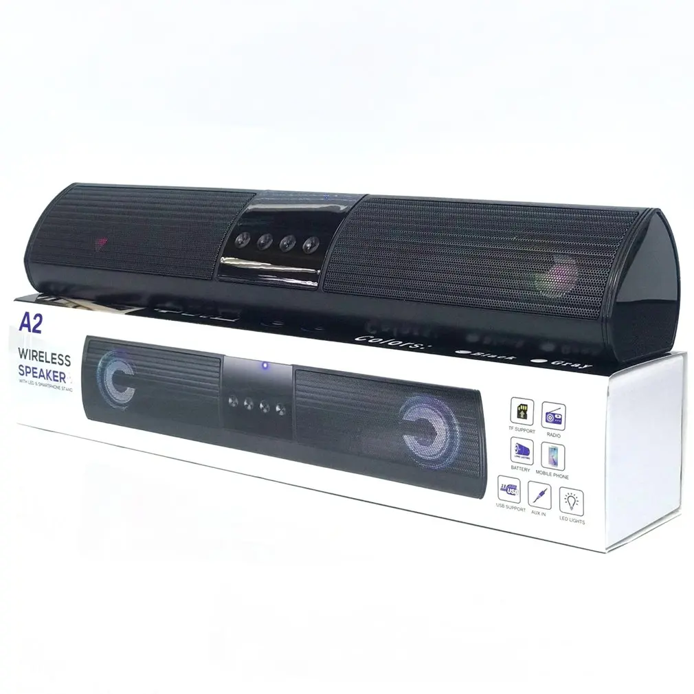 Особенности: 1. 360 градусов стерео звук и потрясающий Бас Звук: стерео звук с полным басом, динамик обеспечивает захватывающий звук с богатыми басами, средними и высокими частотами, динамическим звуком. 2. Водонепроницаемость IPX5: Устойчив к брызгам, дождю, нежному распылению, поэтому применяется в душевой комнате, у бассейна или пляжа и даже под дождем. Не кладите непосредственно в воду. 3. Сильный беспроводной сигнал 5,0: он может нормально подключаться в сложных условиях и сигнал не нарушается. Воздушный дизайн с Беспроводной 5,0 обеспечивает большую Беспроводной rangeand эффективная связь к Беспроводной сотовом телефоне или устройств. 4. Широкая совместимость: беспроводной чип 5,0 легко читает список воспроизведения музыки и подключает любые устройства. Он может не только подключить ноутбук, телефон, MP3, для iPhone, для iPad, но и персональный компьютер, телевизор, или другие беспроводные устройства с 3,5 мм аудио разъемами. 5. В качестве подарка: это идеальный подарок для мужчин или женщин, также Доступные подарки на день матери. Описание: Беспроводные колонки маленькие, предназначены в качестве портативного динамика. Достаточно хорошо подходит для любых видов активного отдыха. Специально разработан как напольные динамики. Характеристики: Модель: A2 Материал: пластик Размер: 400x70x70мм Беспроводная: V5.0 Время работы: 2-4 ч Аккумулятор: 1200 мАч Функция: TF, FM, USB, AUX Выходная мощность: 2 + 5 Вт Отношение сигнал-шум: ≥ 80 дБ Частотный диапазон отклика: 100 Гц-20 кГц Зарядное устройство AC/DC + 5V, 500MA Батарея: литиевая батарея 1200ма Посылка включает в себя: 1 х Динамик