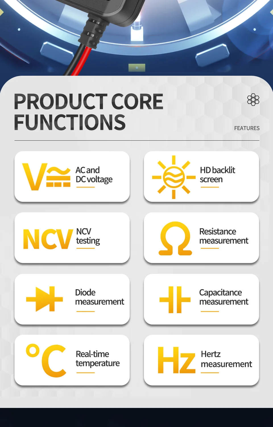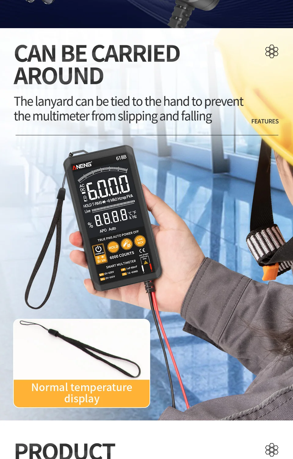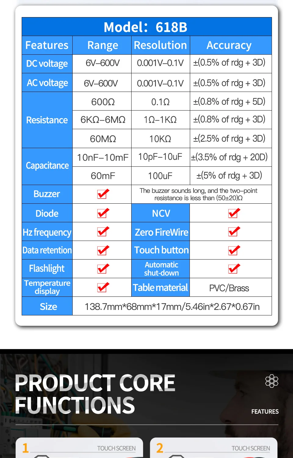 ДиапазонТочностьDCV / ACV6 в/60 в/600 В±(0.5% + 3)DCV / ACV
