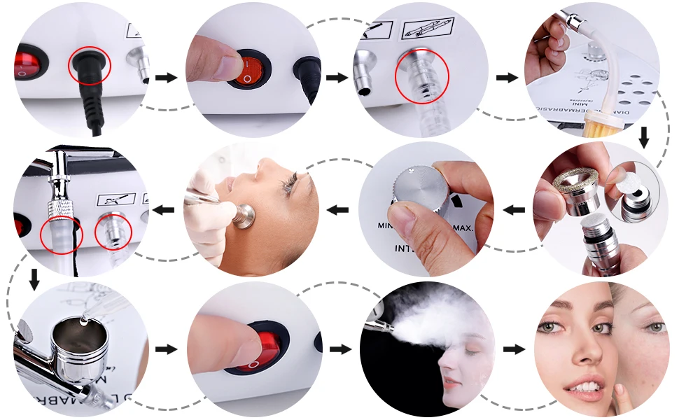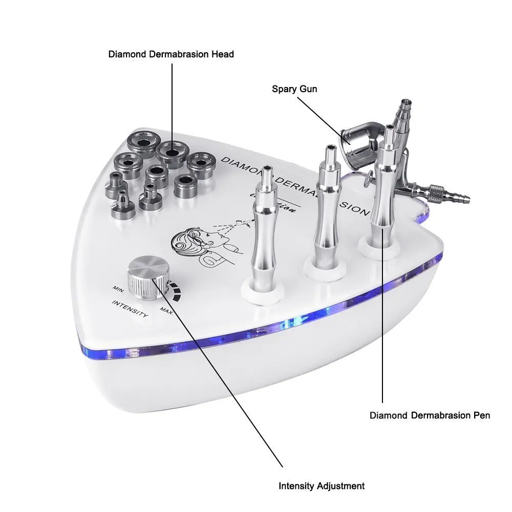 Умеренное использование алмазной дермабразии, сопровождается продуктами кожи, которые проникают через верхний слой кожи, который достигает уровня дермы, помогает восполнять натуральные питательные вещества, восстанавливает активность клеток и способствует здоровью кожи. Все кончики сделаны деликатно и могут непосредственно близко к коже для безопасного и гигенного лечения. Нет необходимости в хрустальных картриджах или воздушном насосе для доставки кристаллов к коже, так что нет шрамов и не повредит кожу.