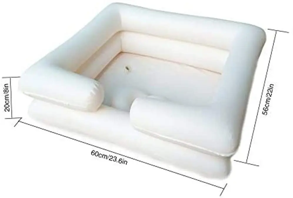 Изготовлен из высококачественного ПВХ, мягкий и легкий для легкого мытья волос, надувная ванна для прикроватного душа. Надувать и сдувать и хранить компактно, когда не используется.