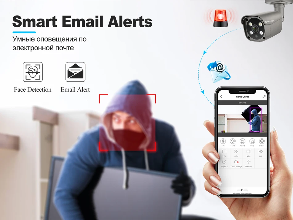 Обнаружение движения + звуковой сигнал тревоги + оповещение по электронной почте + Push-оповещение в приложении