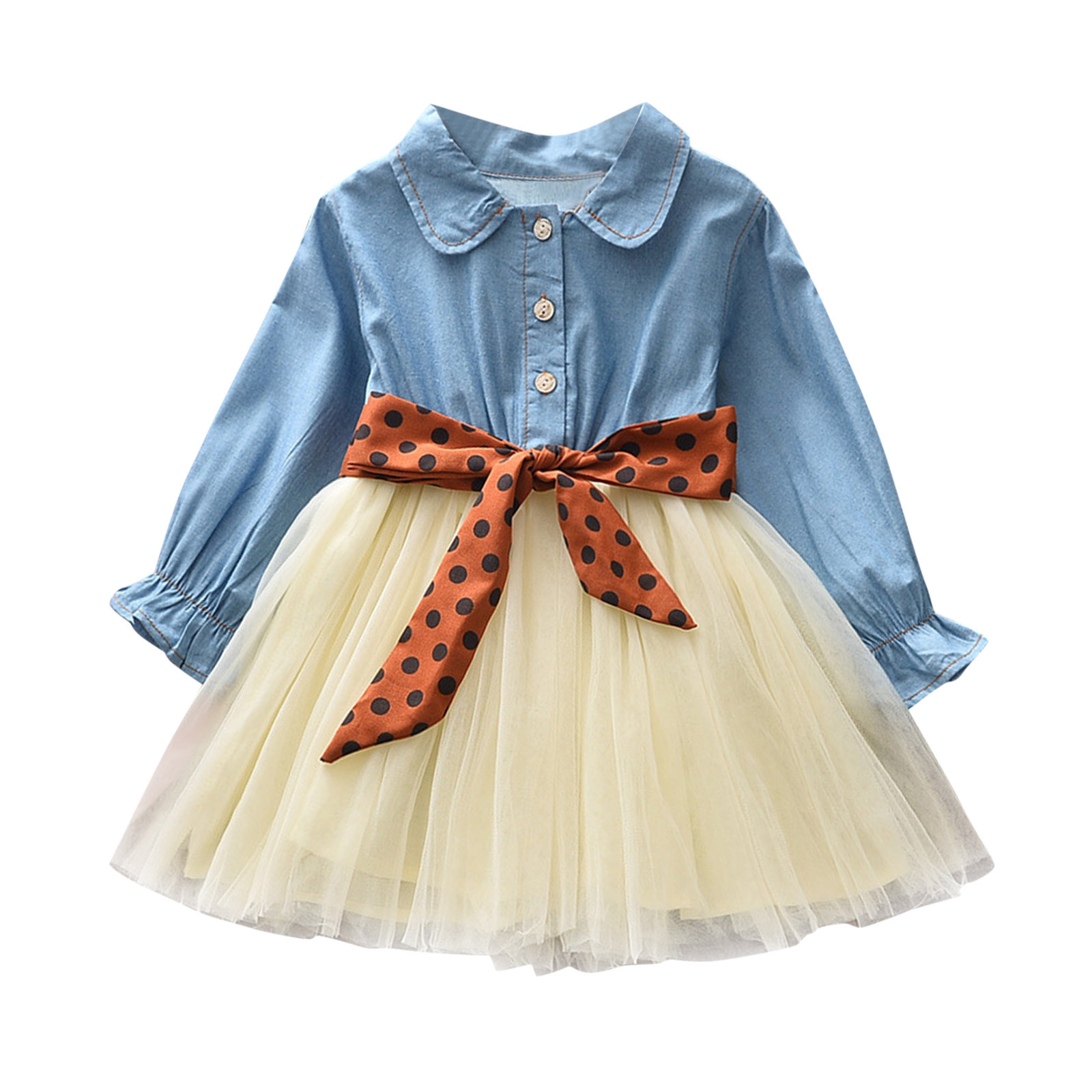 Повседневное джинсовое платье принцессы из тюля с длинными рукавами в горошек и со съемным поясом для маленьких девочек