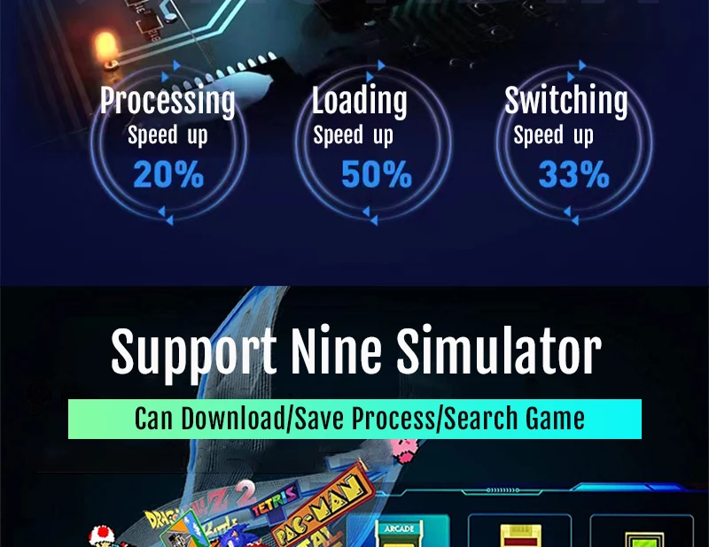 С обновленным чипом процессора GB2 консоль встроена в более чем 9 эмуляторов, совместимых с играми в формате MAME, PS1, GB, GBA, GBC, MD, SFC, FC и ATARI, которую вы можете загрузить и сохранить на своей карте памяти;