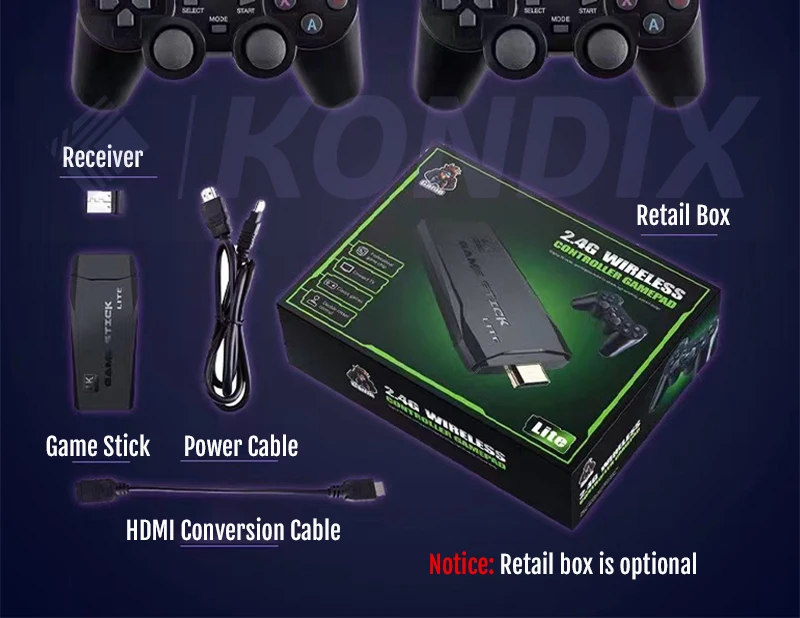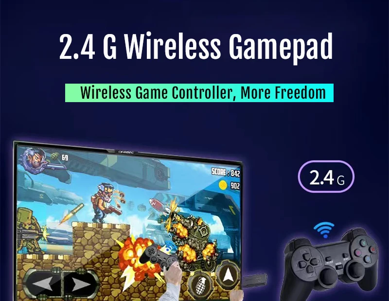 Оснащен двумя 2,4 ГГц беспроводной игровой контроллер. Поддержка до 4 игроков одновременно, вы можете дистанционно управлять и наслаждаться игрой на диване с семьей или друзьями.