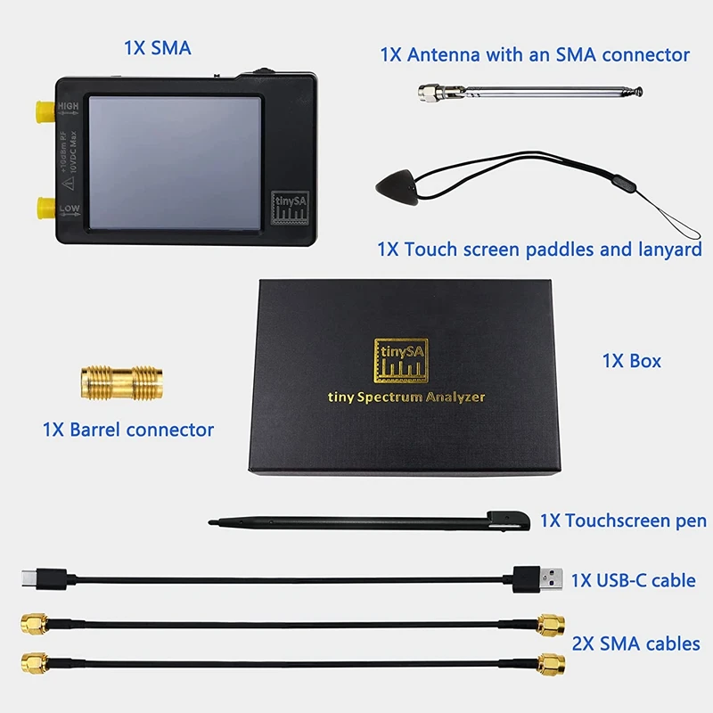 [Хорошее обслуживание] посылка: 1 миниатюрный анализатор спектра, 2x20 см RF кабель, 1 x USB-C кабель, 1 x SMA телескопическая антенна, 1 x SMA разъем 1x Contactscreen ручка, 1xContact экран весла и ремешок не дадут. Встроенный аккумулятор 650mA, перезаряжаемый и портативный в течение не менее 2 часов.
