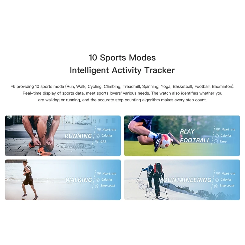 4. 10 спортивных режимов: F6 обеспечивает 10 спортивных режимов (бег, ходьба, езда на велосипеде, спиннинг, альпинизм, беговая дорожка, Йога, баскетбол, футбол, бадминтон). Отображение спортивных данных в реальном времени, часы также могут определить, ходите ли вы или работаете, и точный алгоритм подсчета шагов может подсчитывать каждый шаг.