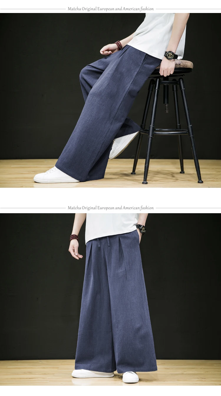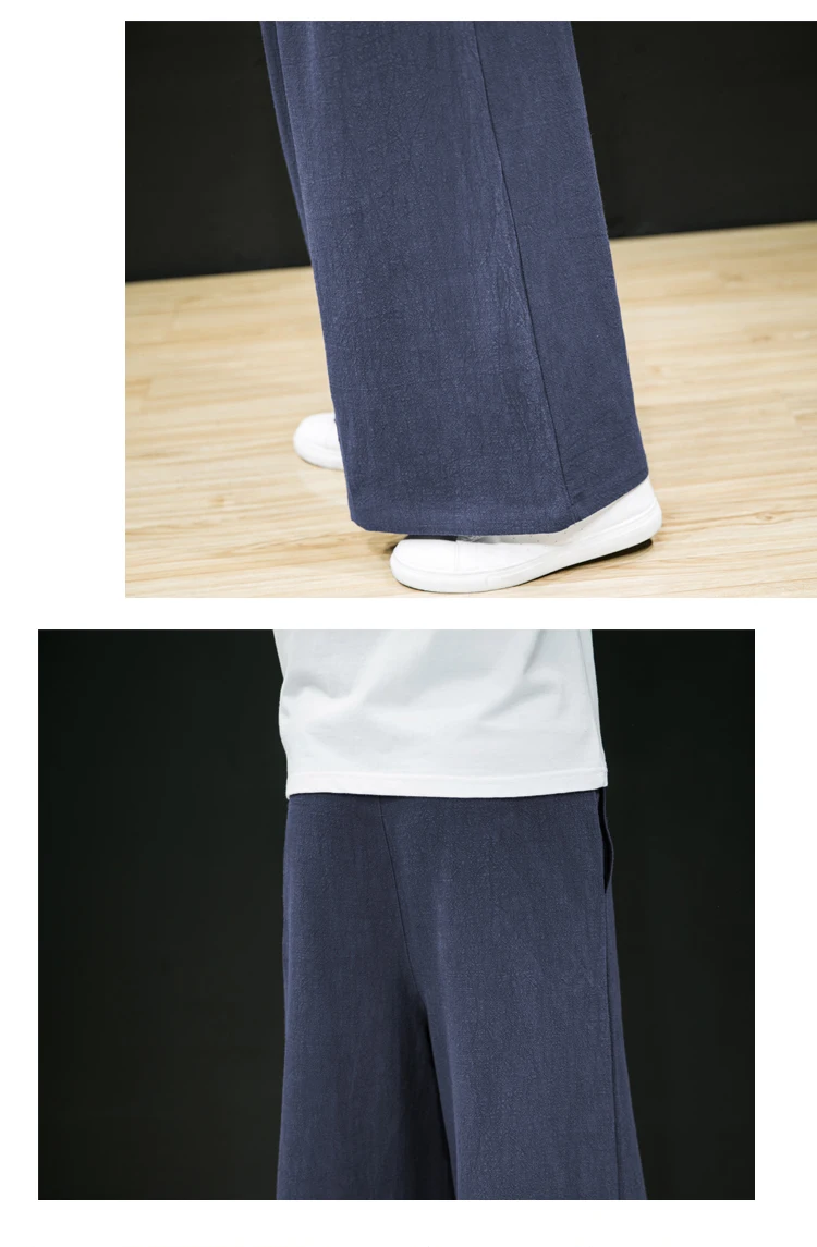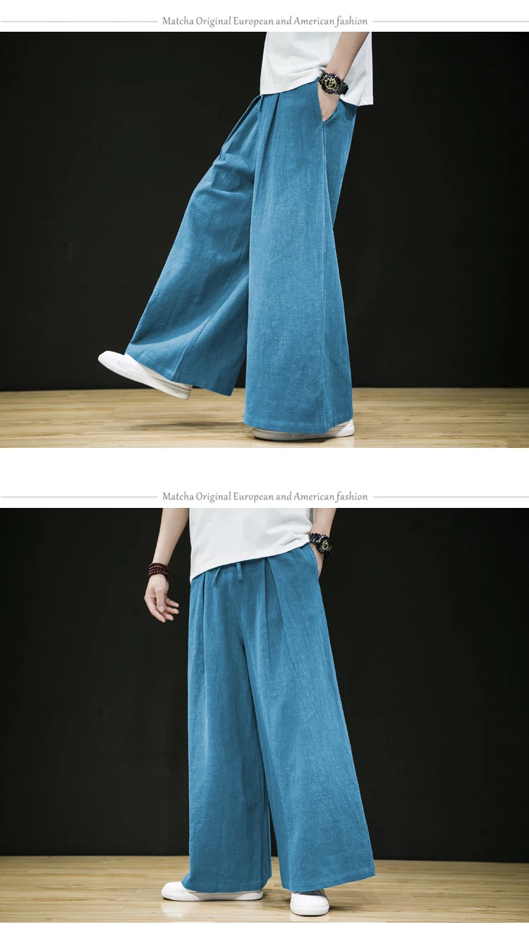 Хлопок, лен, широкие брюки, светильник, синие льняные брюки для мужчин, красный, китайский, Восточный стиль, Хакама, свободные, бордовые, монах, одежда, Zen Pants
