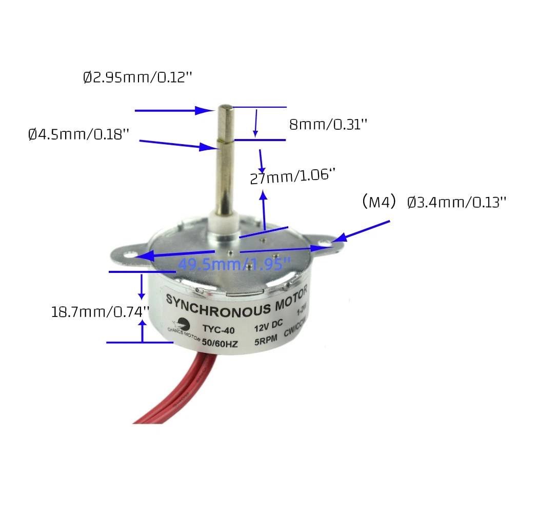 【Specification:】 Название продукта: синхронный двигатель, Модель: TYC-40; Скорость: 5 об/мин; Вал Диаметр: 4,5 мм; Вал Длина: 35 мм; Направление: с заглушкой по часовой стрелке против часовой стрелки (UNCONTROLLAB); крутящий момент: ≤ 0,5 кг * см; Частота: 50/ 60 Гц;