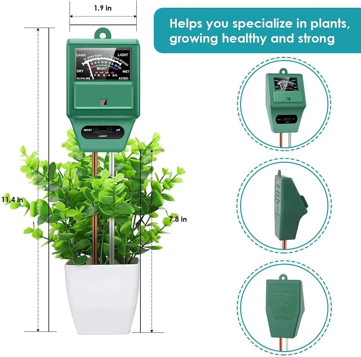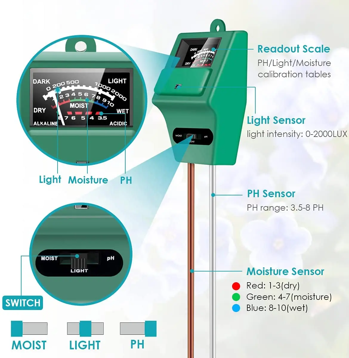 🌻Измеритель влажности почвы только для определения pH почвы, не подходит для других жидкостей, и значение по умолчанию устанавливается в пределах 7-8, убедитесь, что вы переключаете кнопку на pH при использовании.