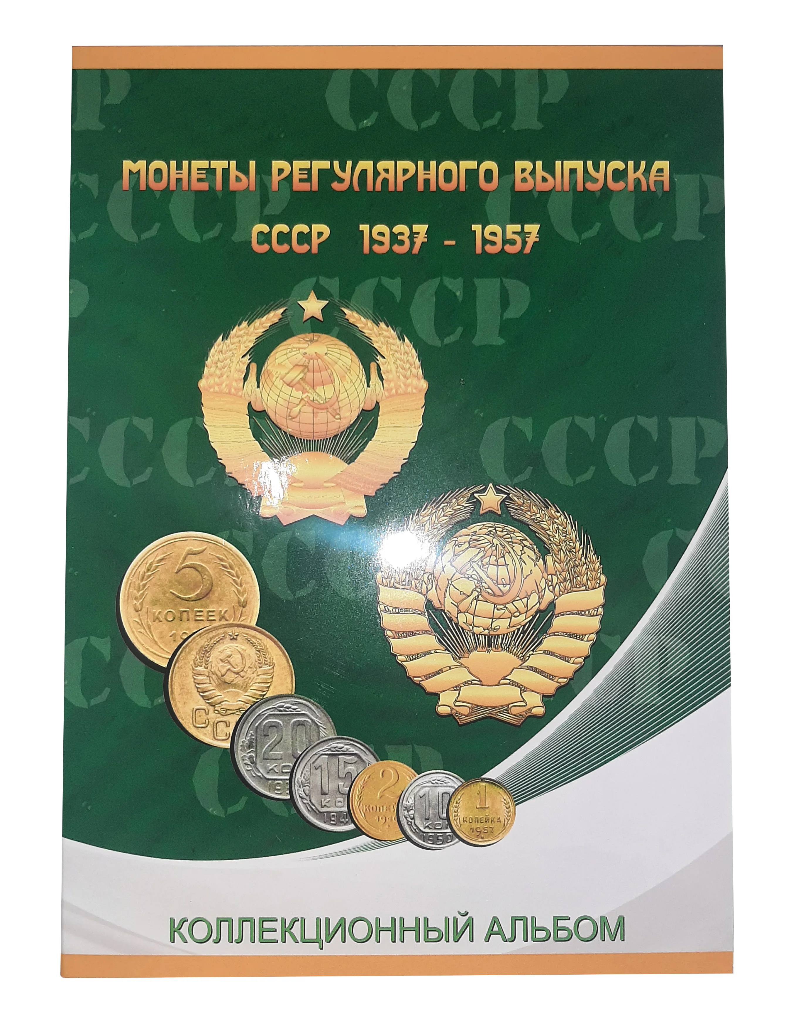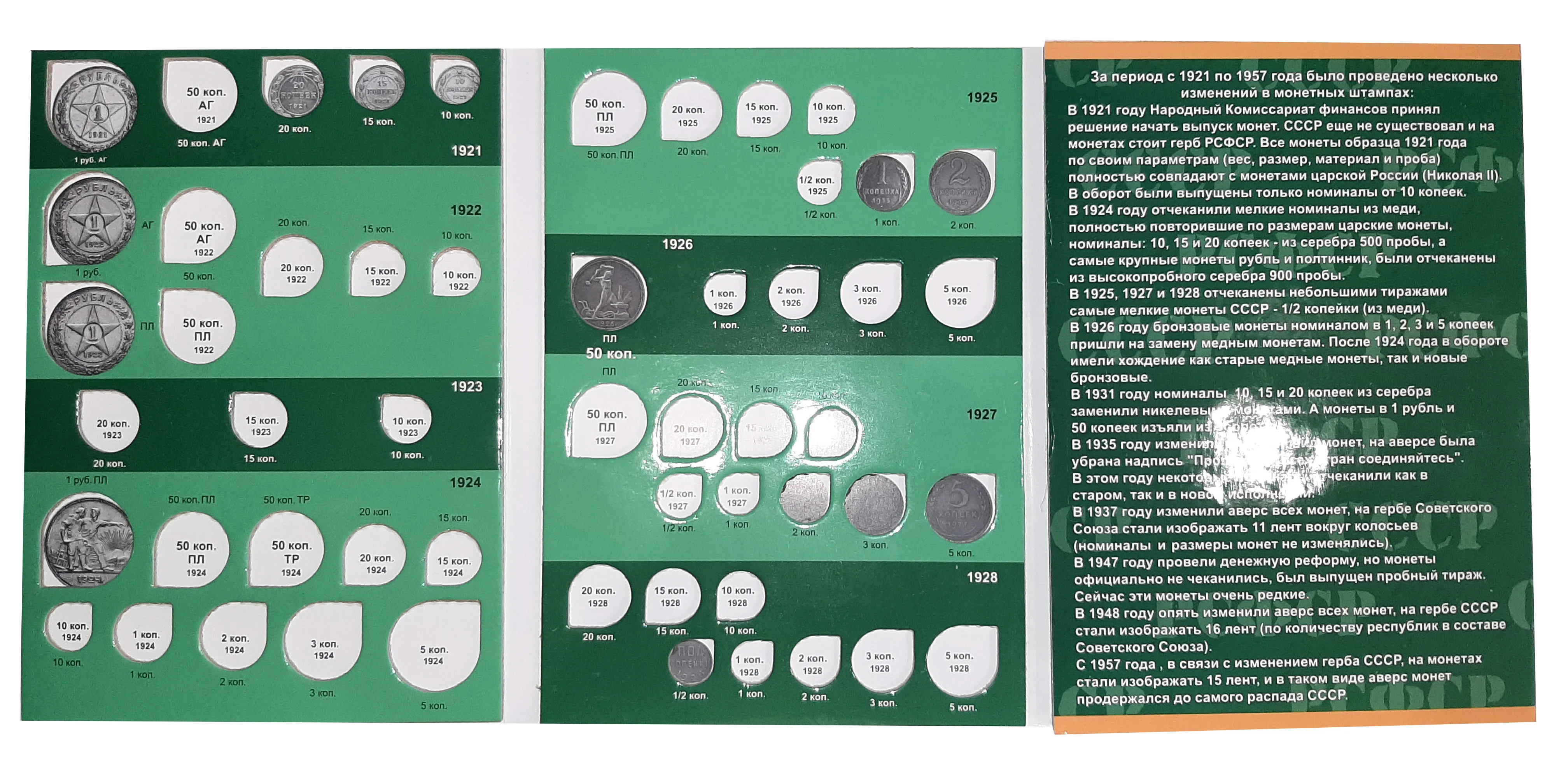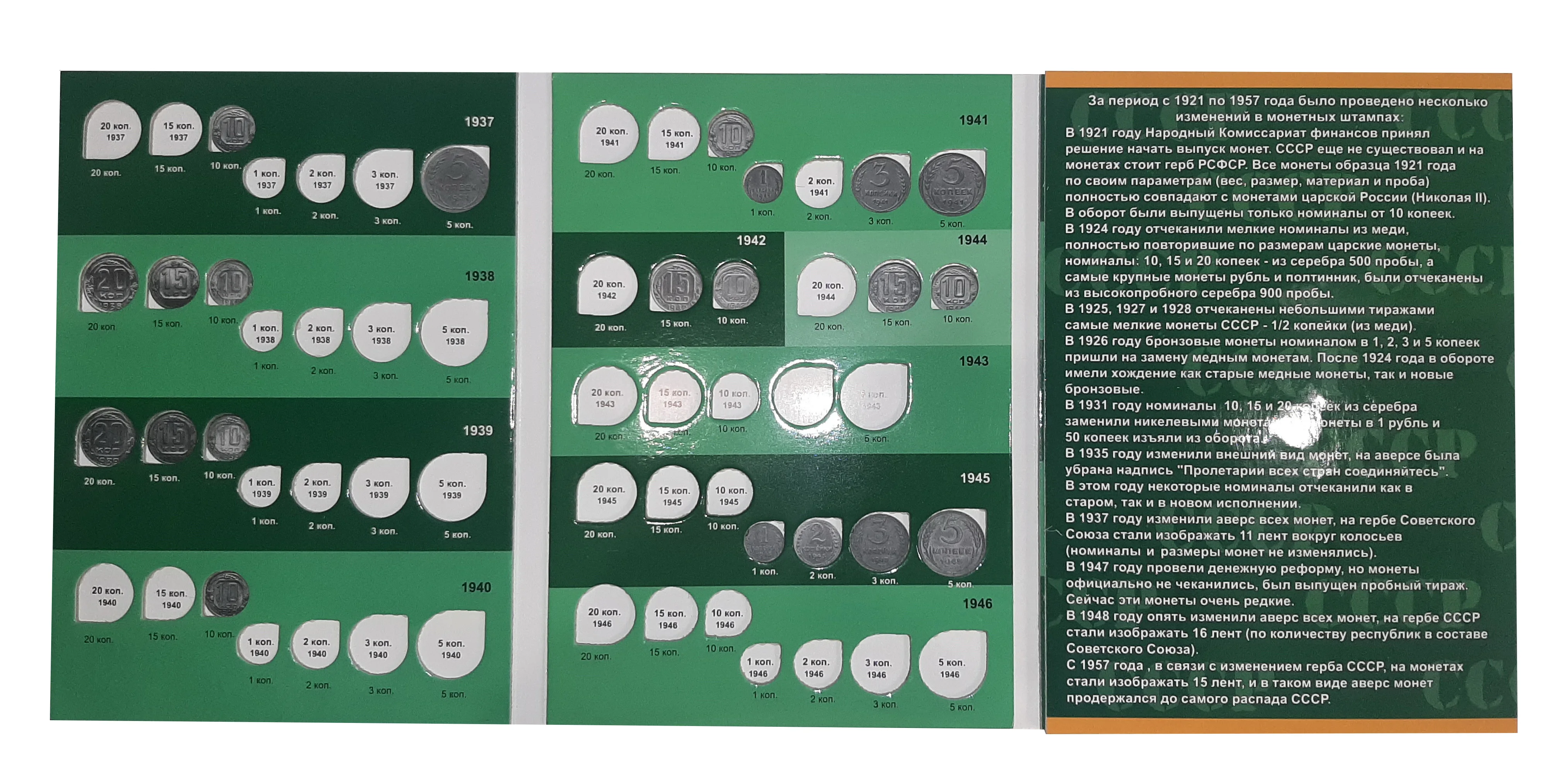 Альбом-планшет для размещения наборов (регулярного выпуска) монет СССР с 1921 по 1957 год включительно.