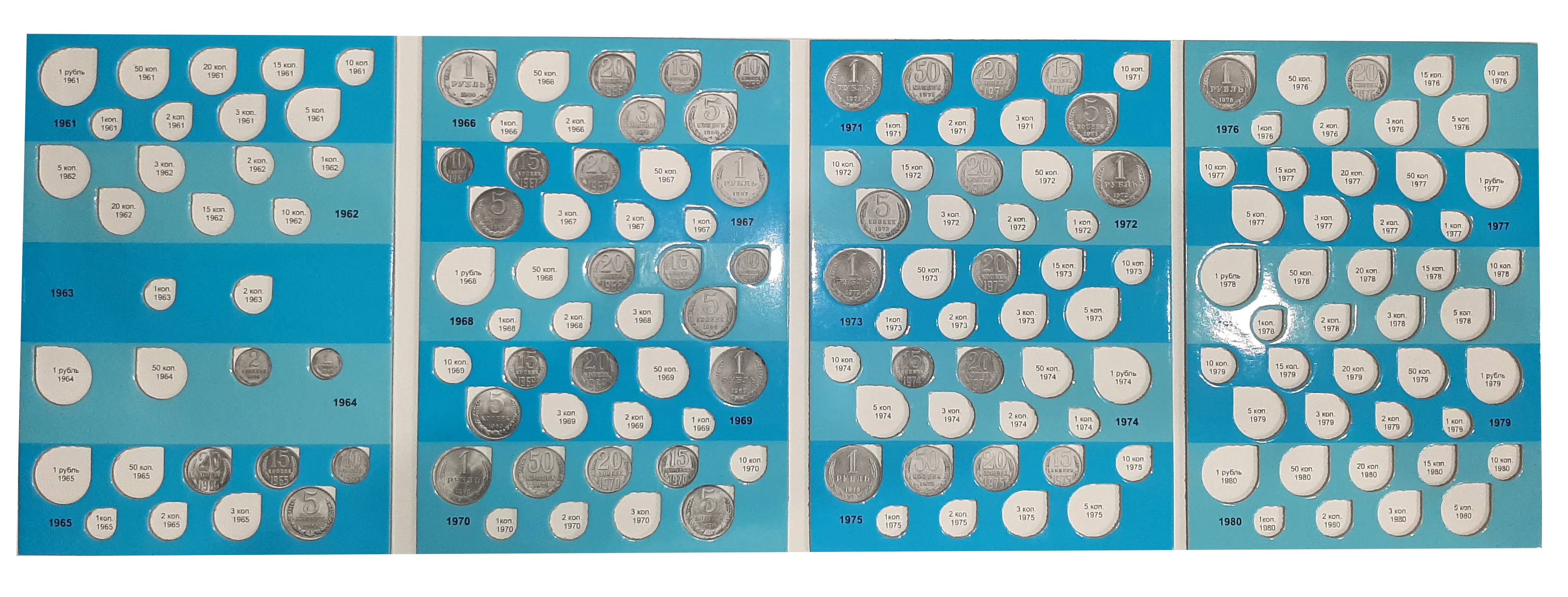 Альбом-планшет для размещения наборов (регулярного выпуска) монет СССР с 1961 по 1991 год включительно.