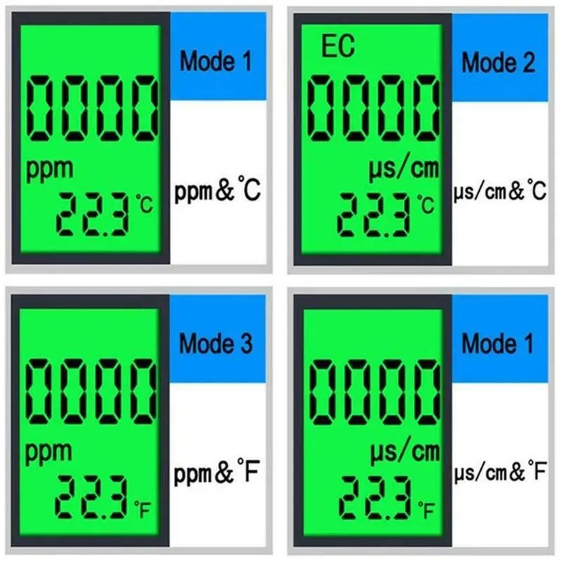 4 режима отображения: Нажмите кнопку переключения: TDS-ppm и °C, EC-μs/cm и °C, TDS-ppm и °F, EC-μs/cm и °F.