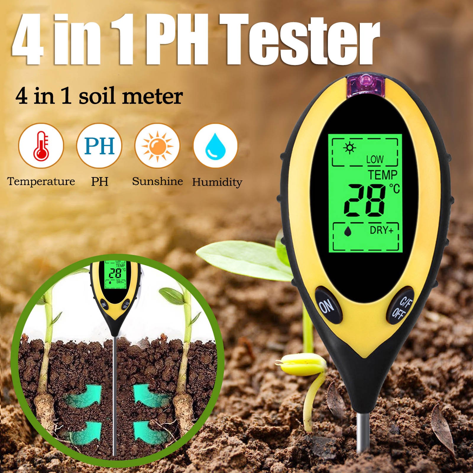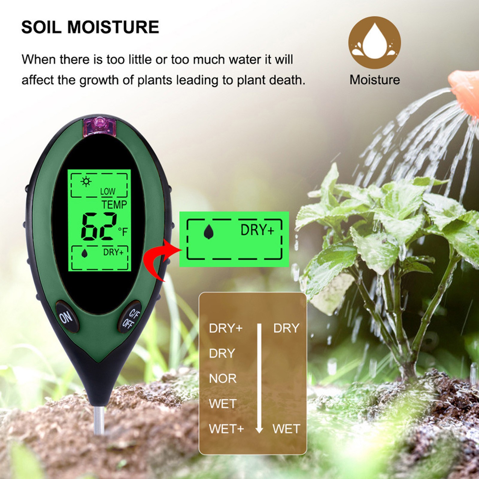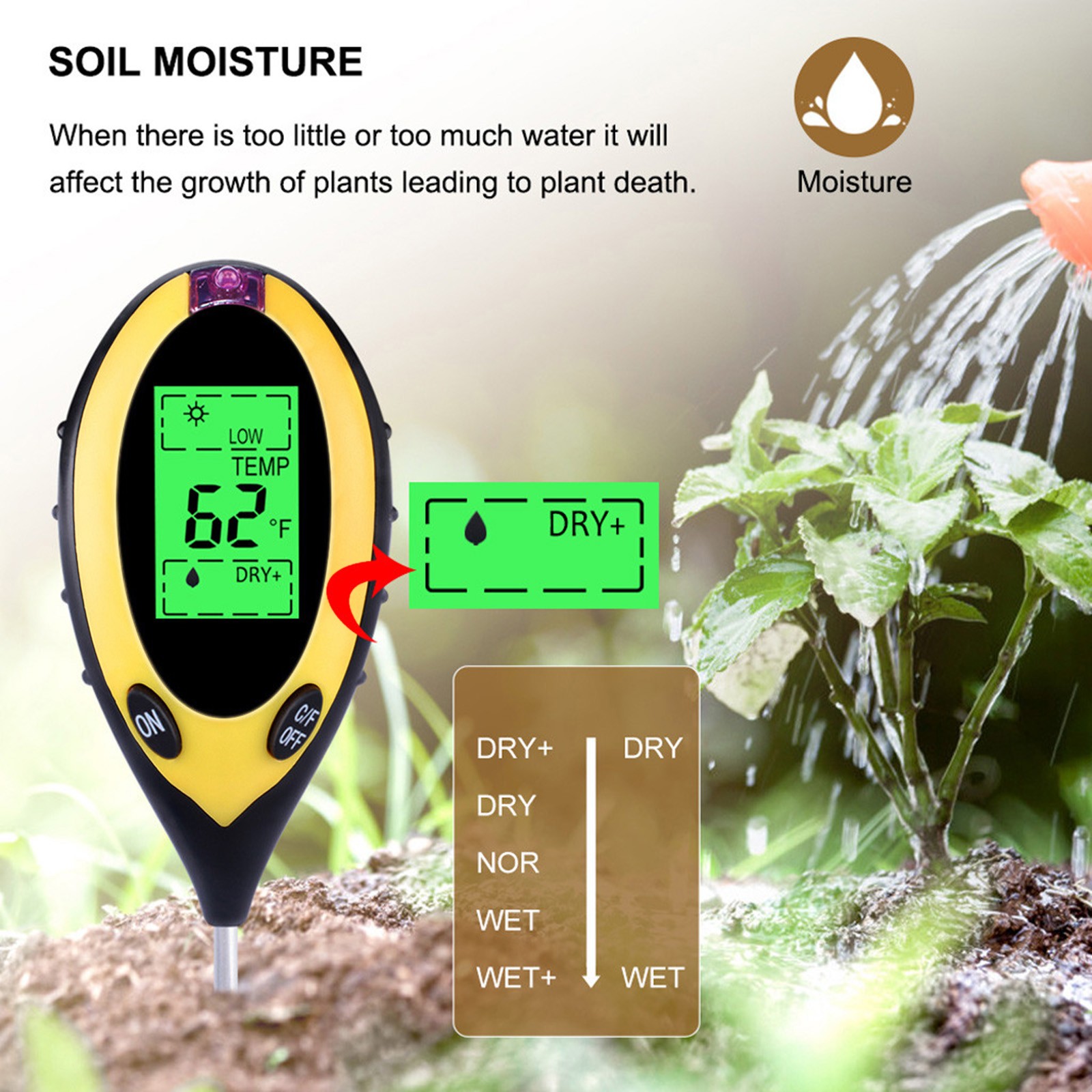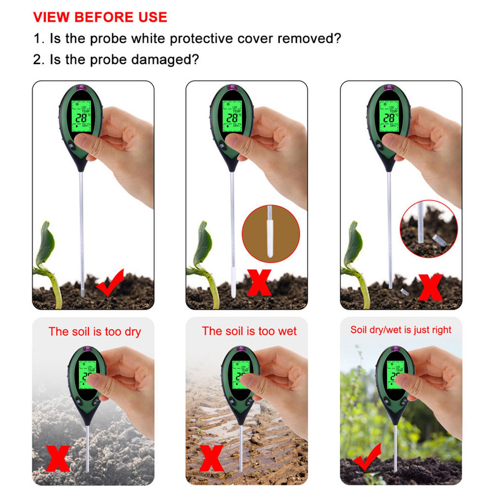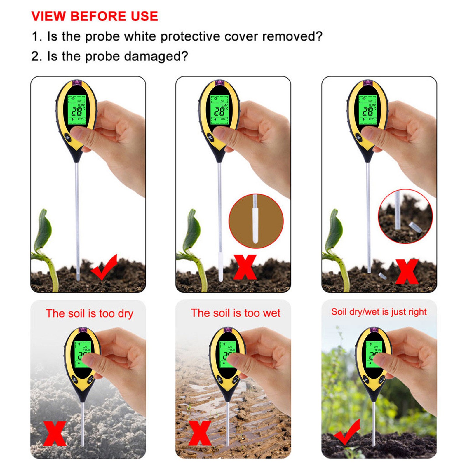 Вы устали от того, что ваши растения умерли? Надоело быть окруженным вогнутыми и коричневыми образцами? Если да, то проблема может быть с вашей почвы, и т. д., все, что вам нужно, это «3 в 1»Влажность, PH и светильник с простой шкала считывания. Вашим растениям никогда не нужно бояться, что вы снова будете страдать от них с помощью этого простого в использовании и научно точного измерительного устройства.