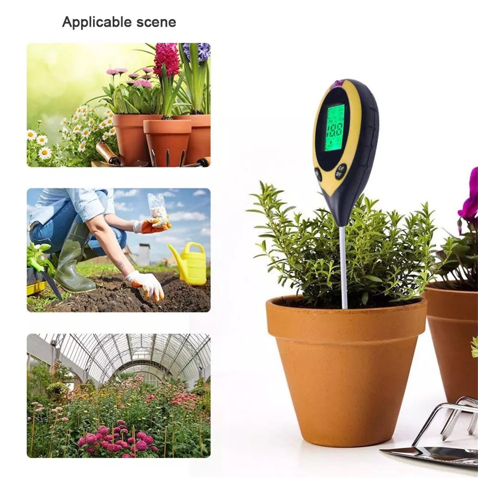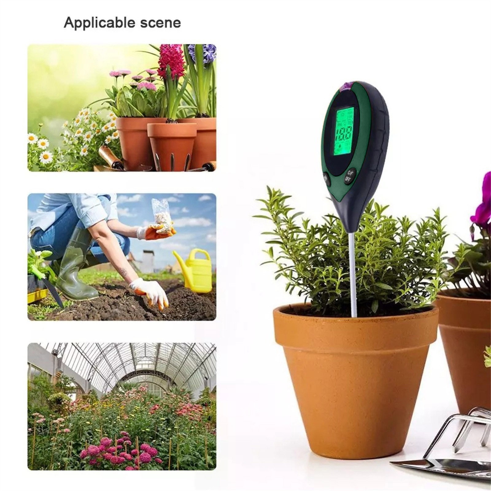 Он применим ко всем видам садоводческих мест для удовлетворения испытаний почвы всех видов посадочных мест, балконных цветов и растений, садовых дворов, теплиц цветников, теплиц посадки, садовых растений и ухода за растительностью