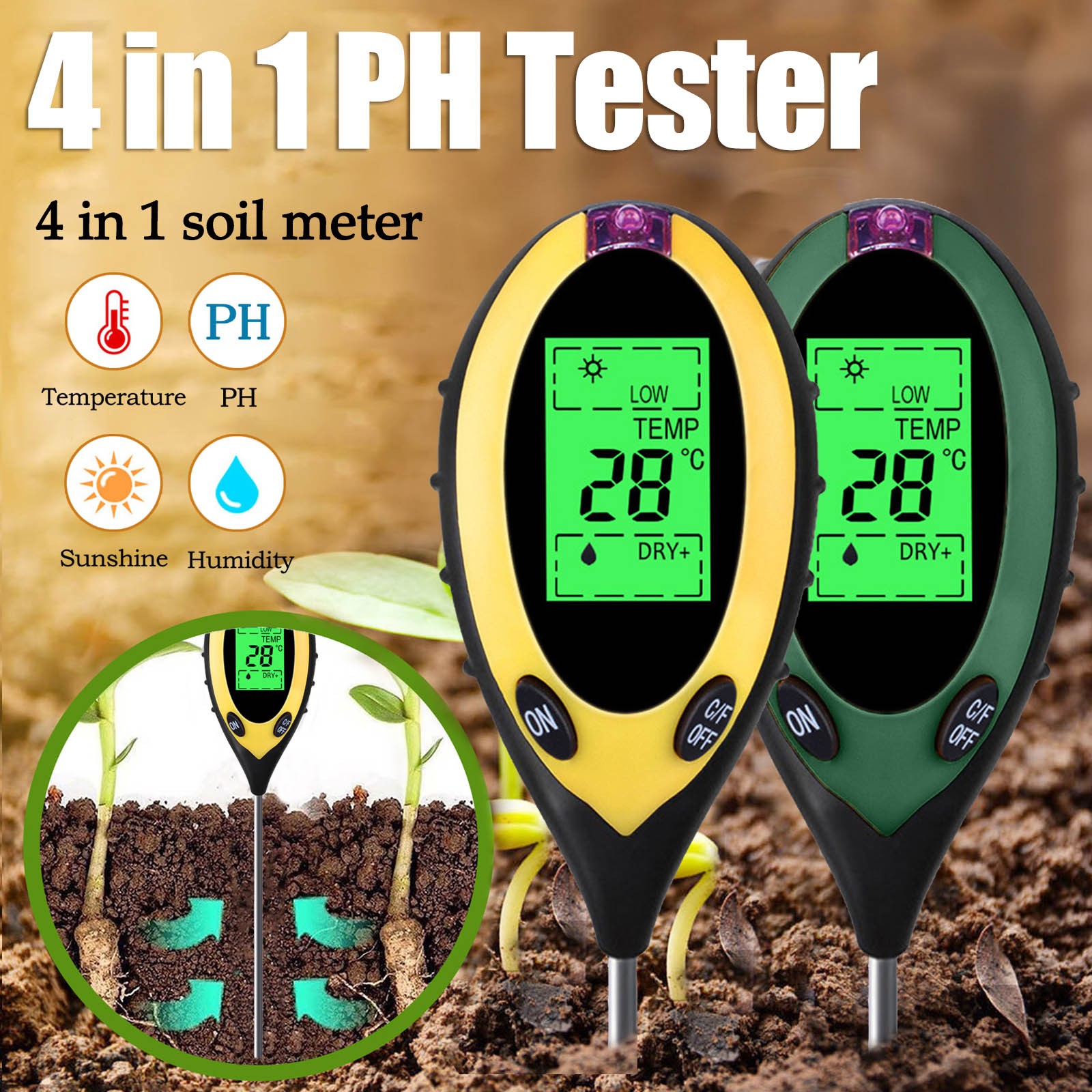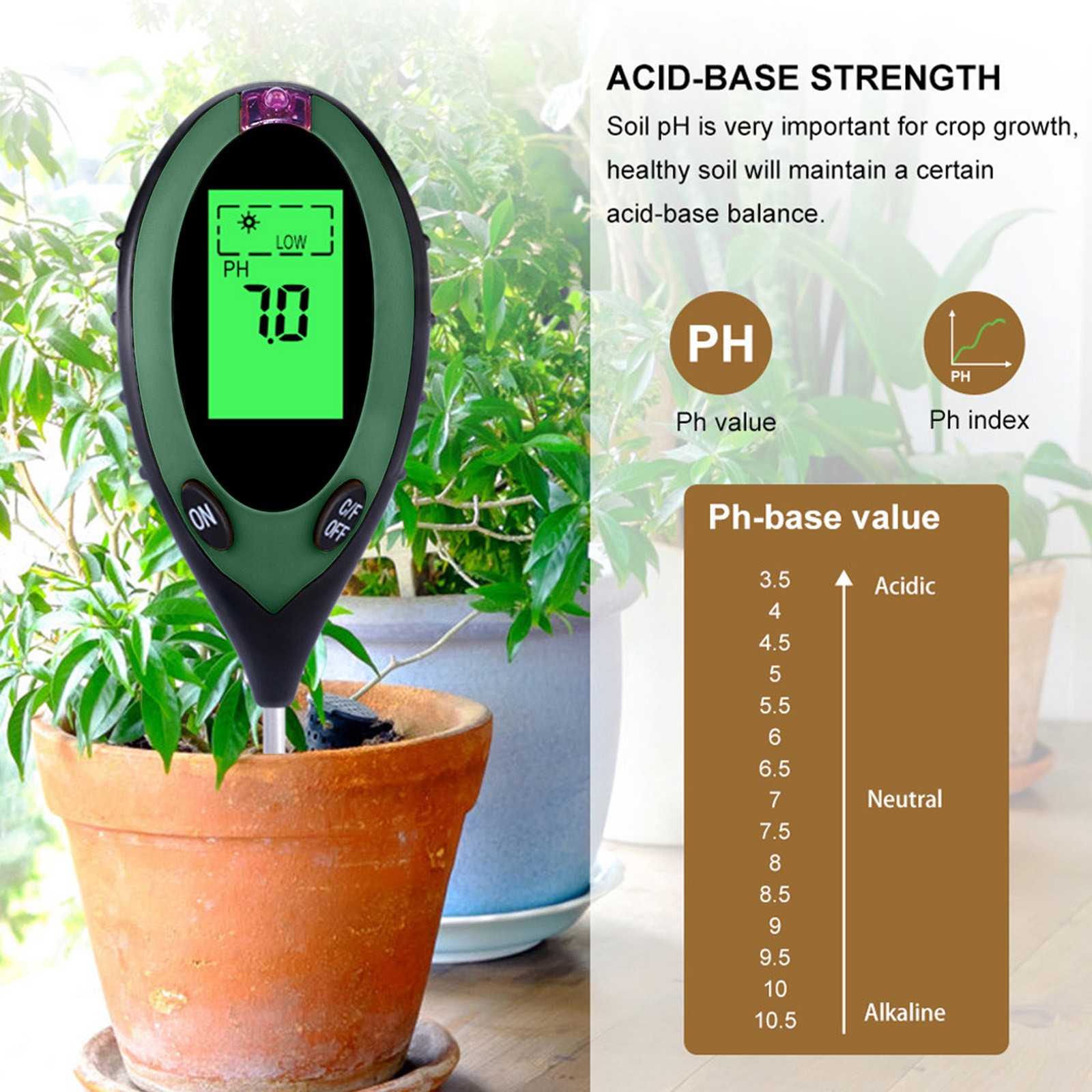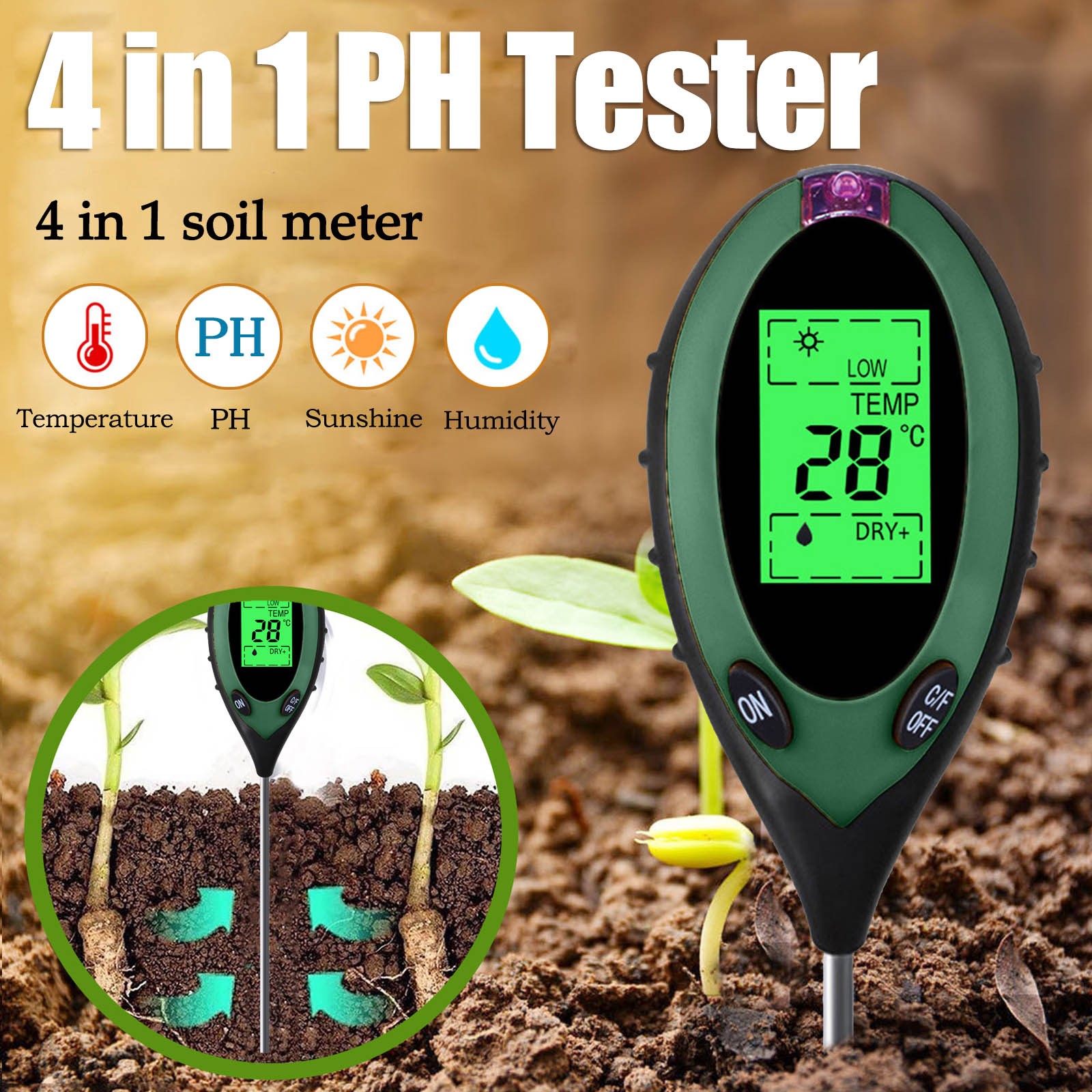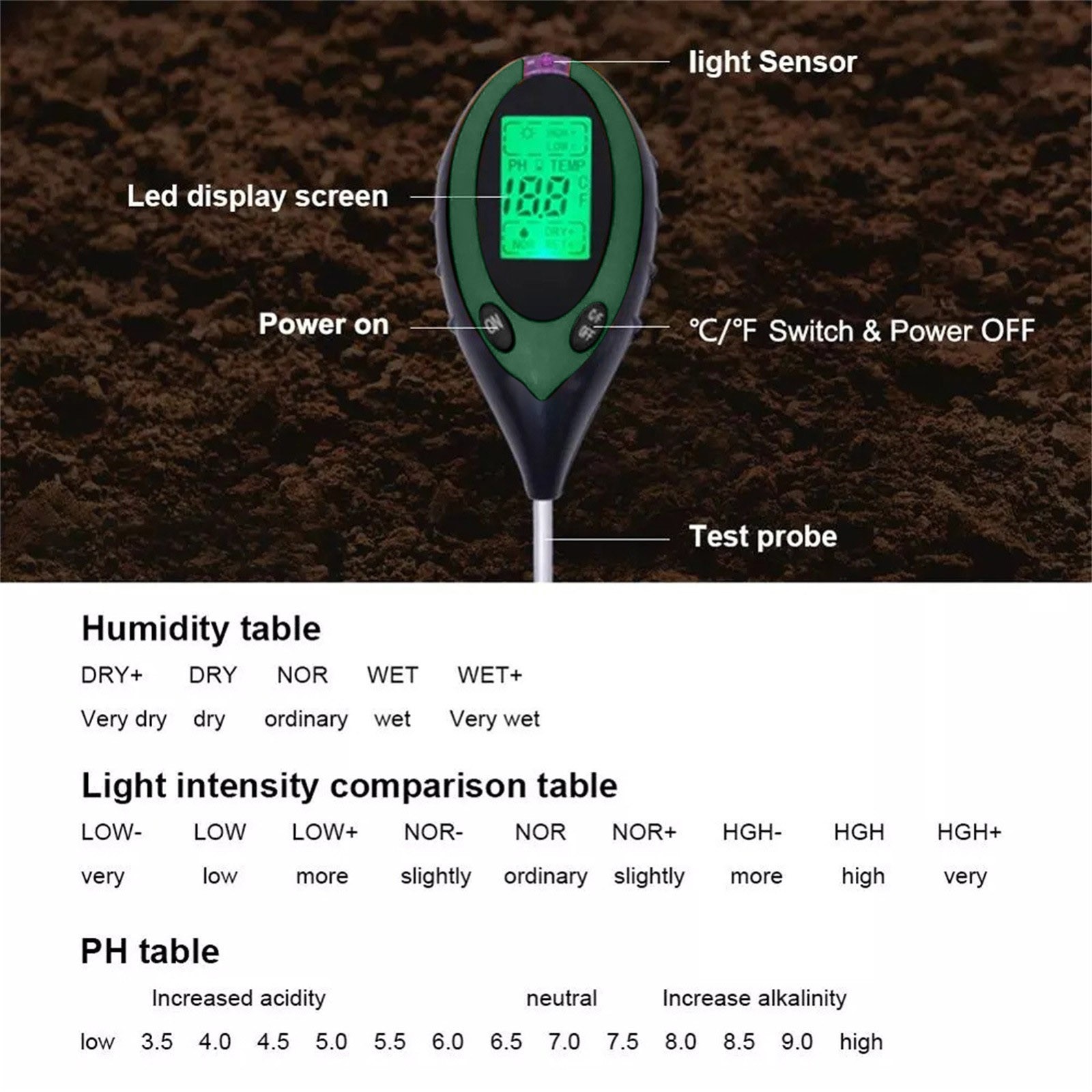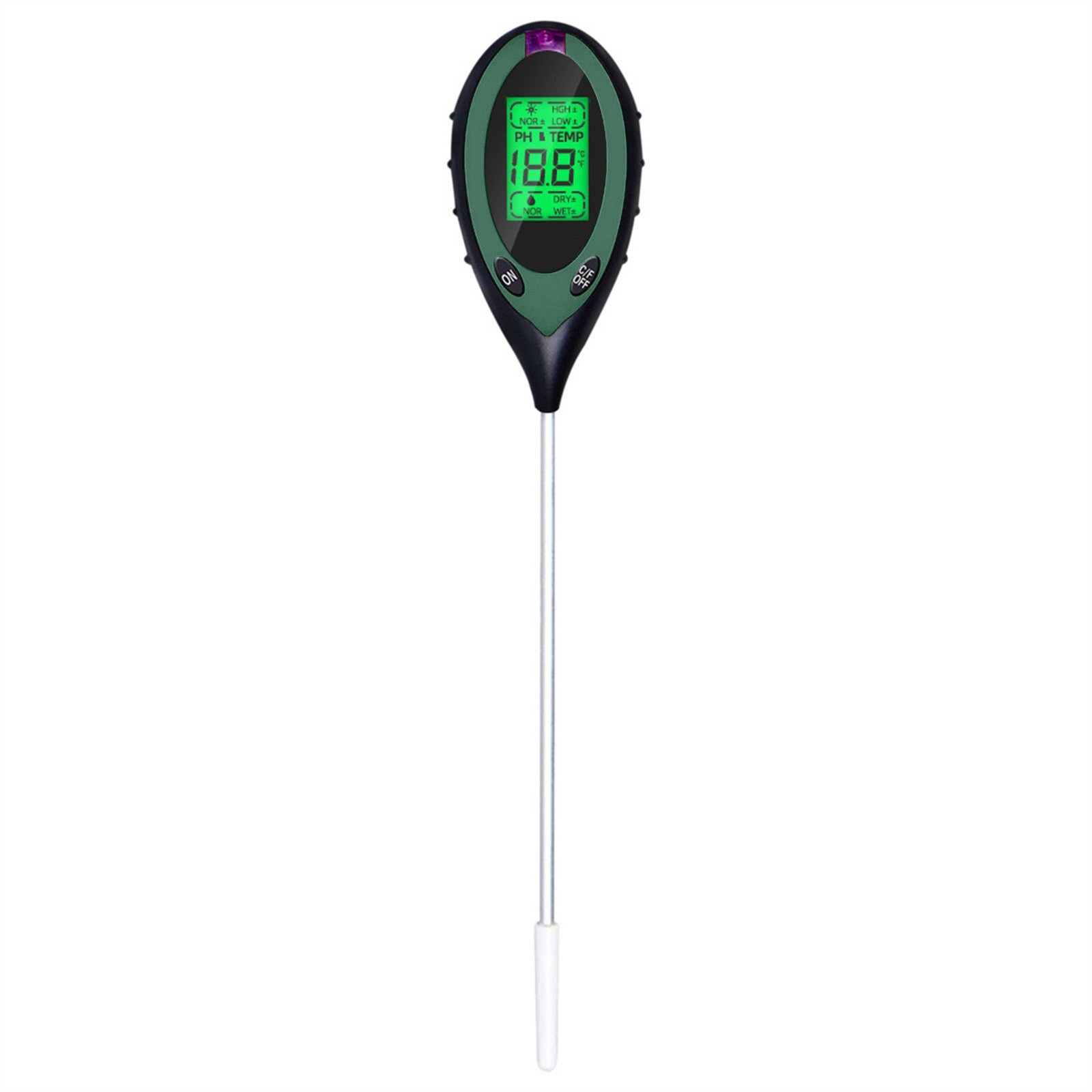 Без батареек щипцы измеряютВлажностьИ pH содержание почвы от уровня корня и определить, идеально ли расположены ваши растения в отношении их позиционирования. ВВлажностьСчетчик Работает со всеми типами грунтов и подходит для использования в дверях или вне дверей-Просто поместите его в грунт, установите в настройки, которые вы хотите измерить и прочитать масштаб.