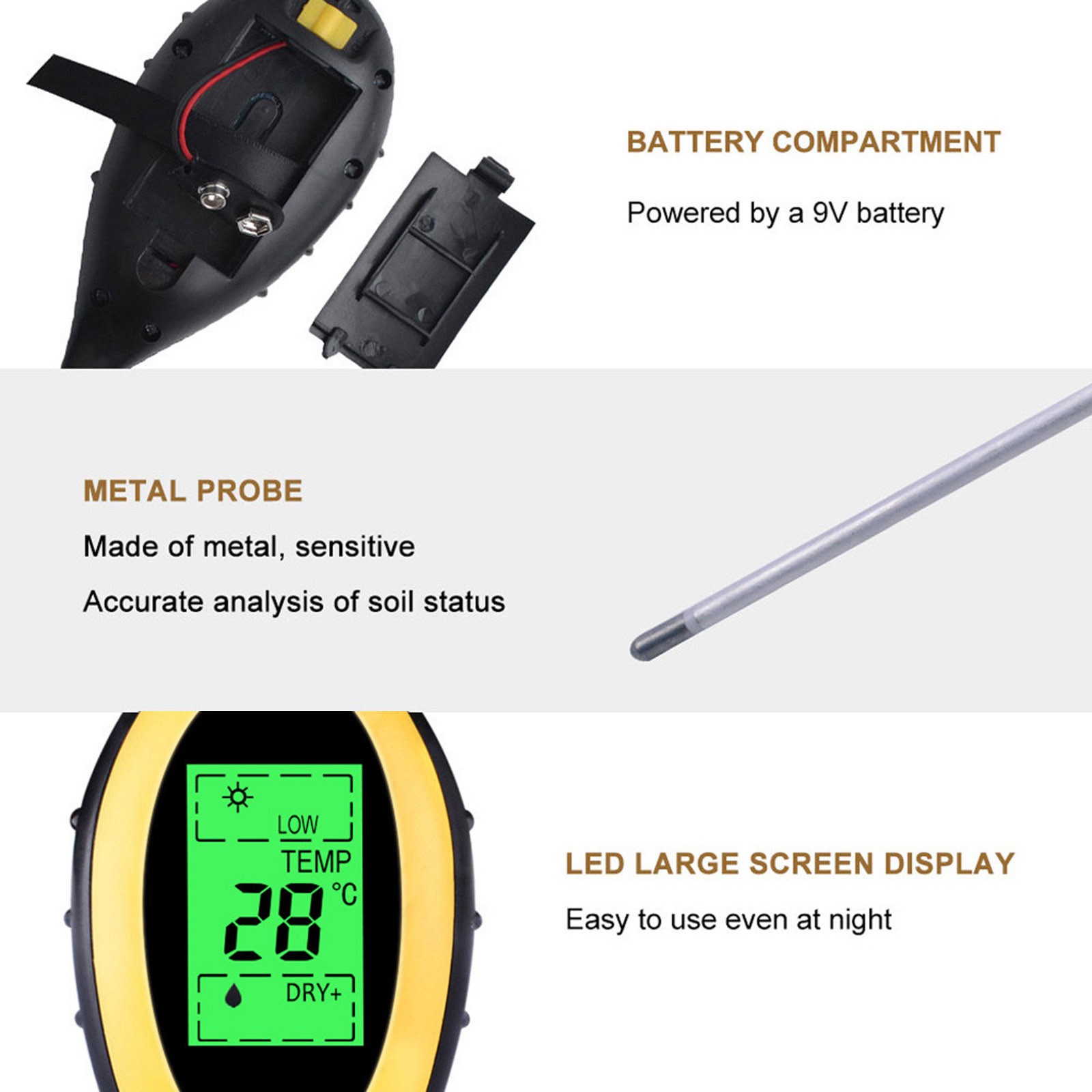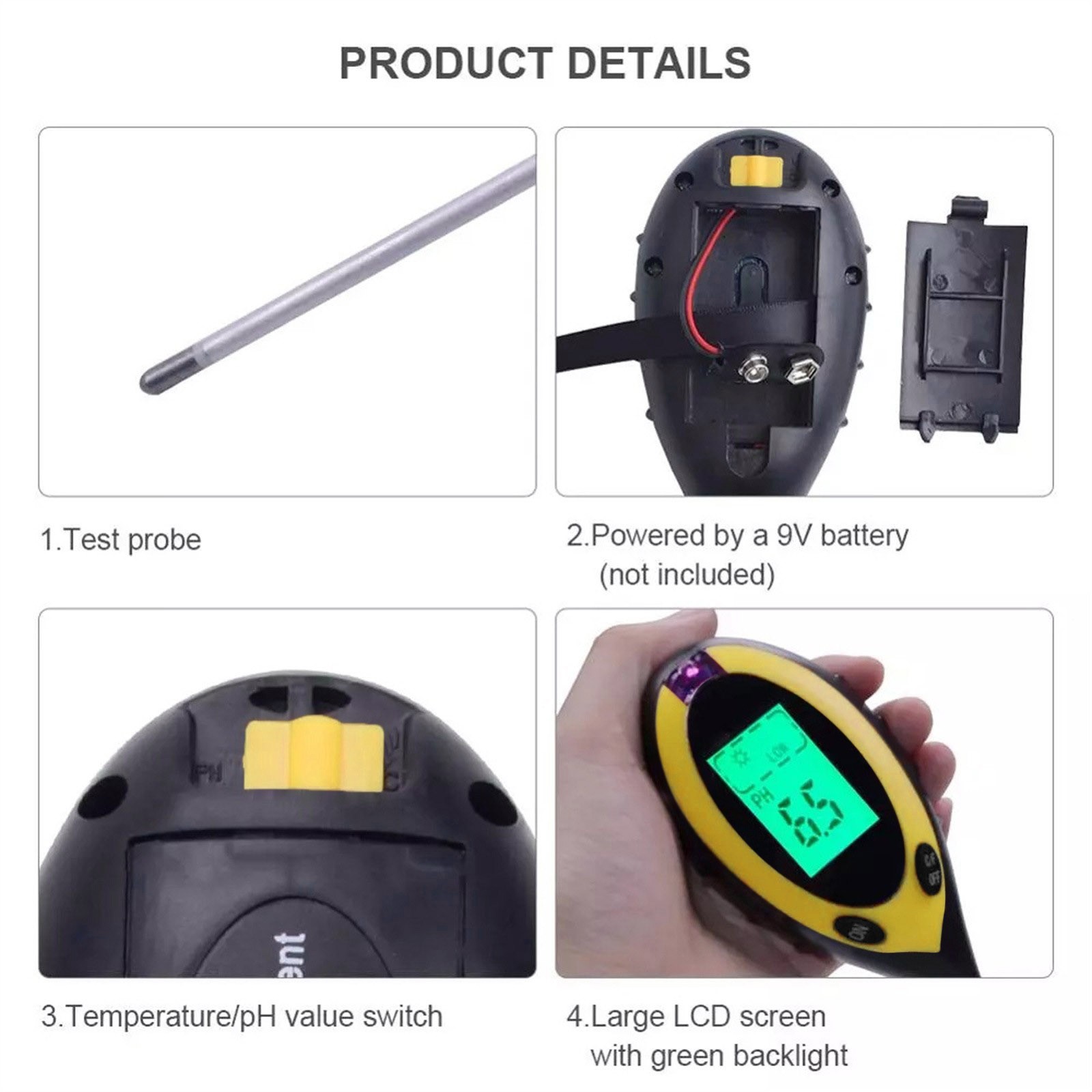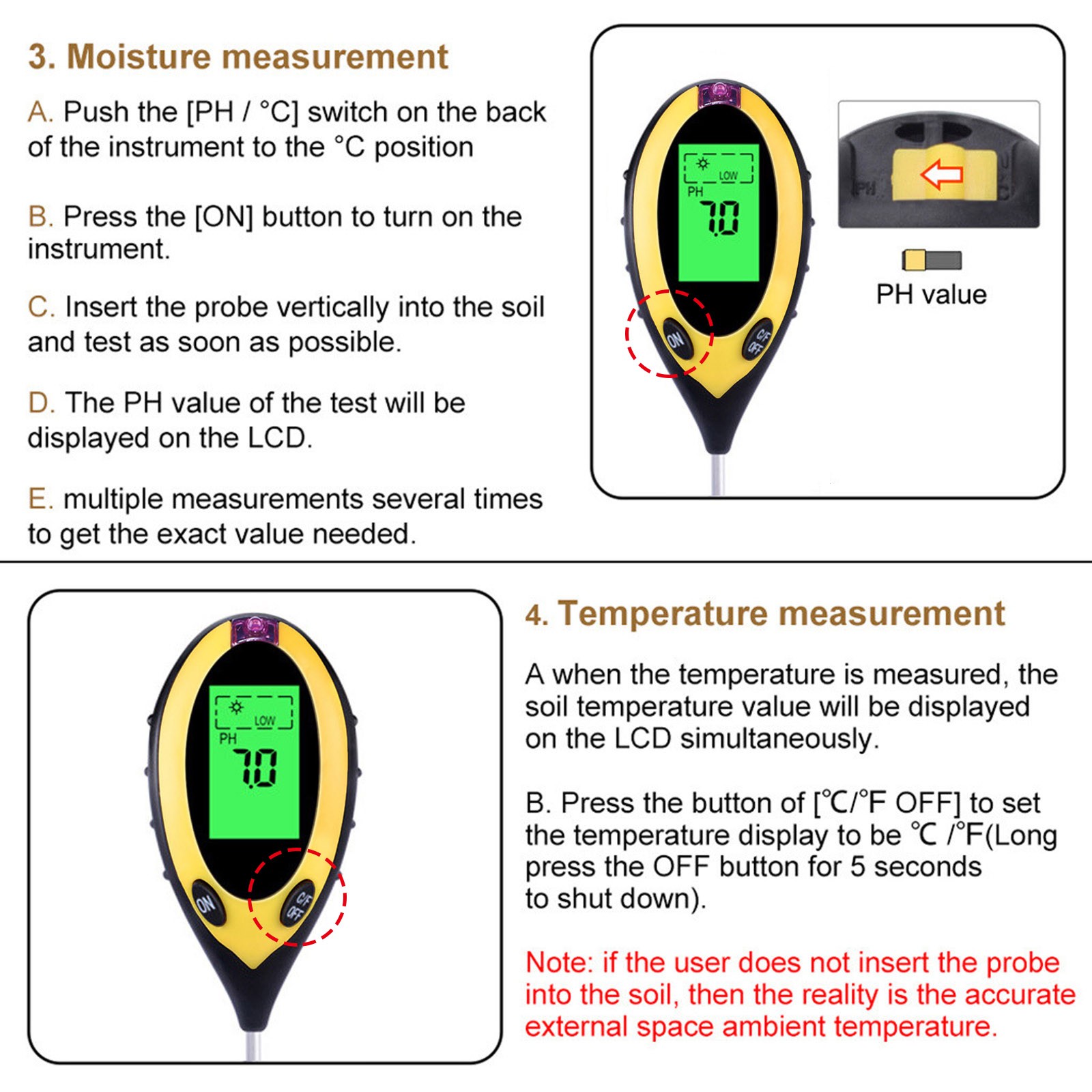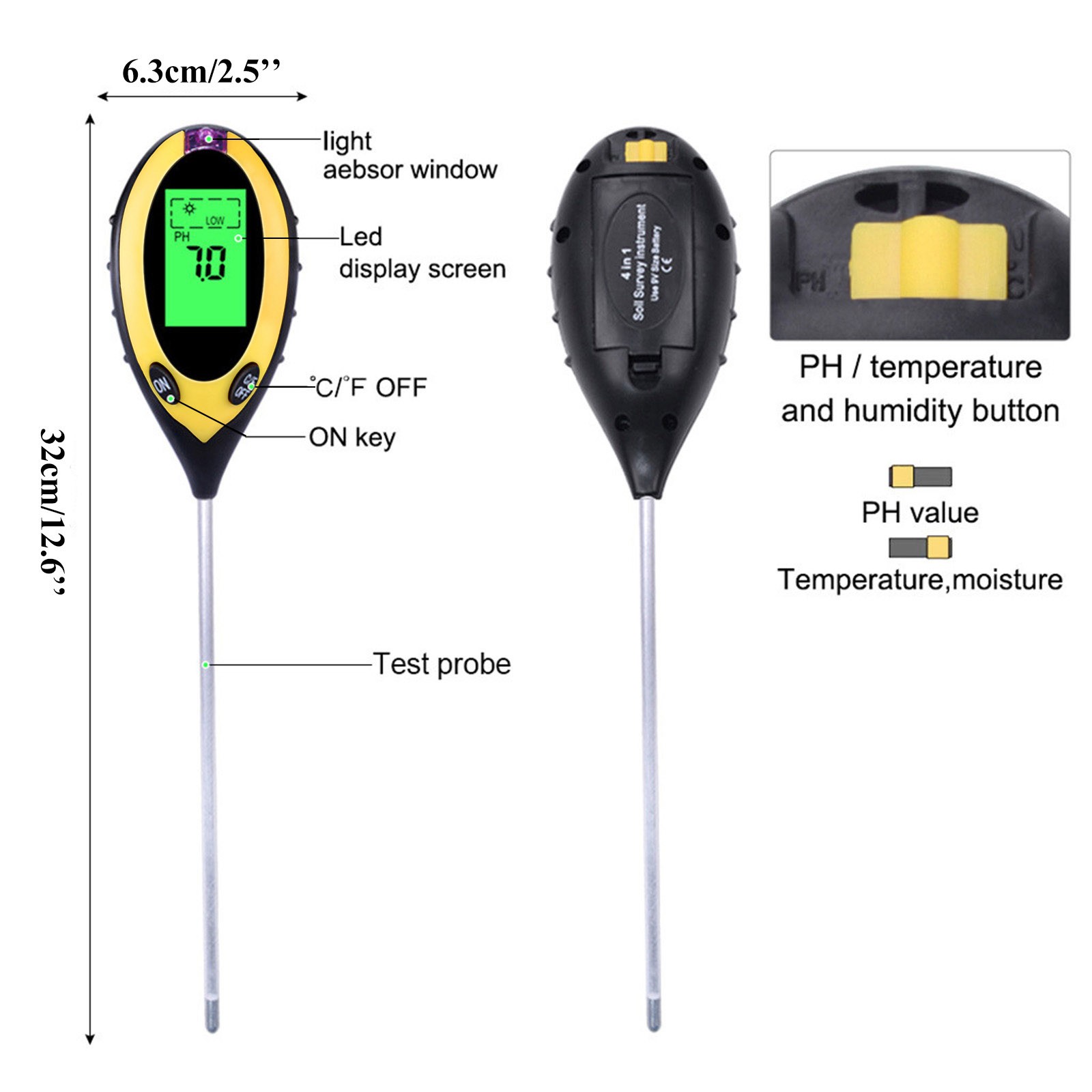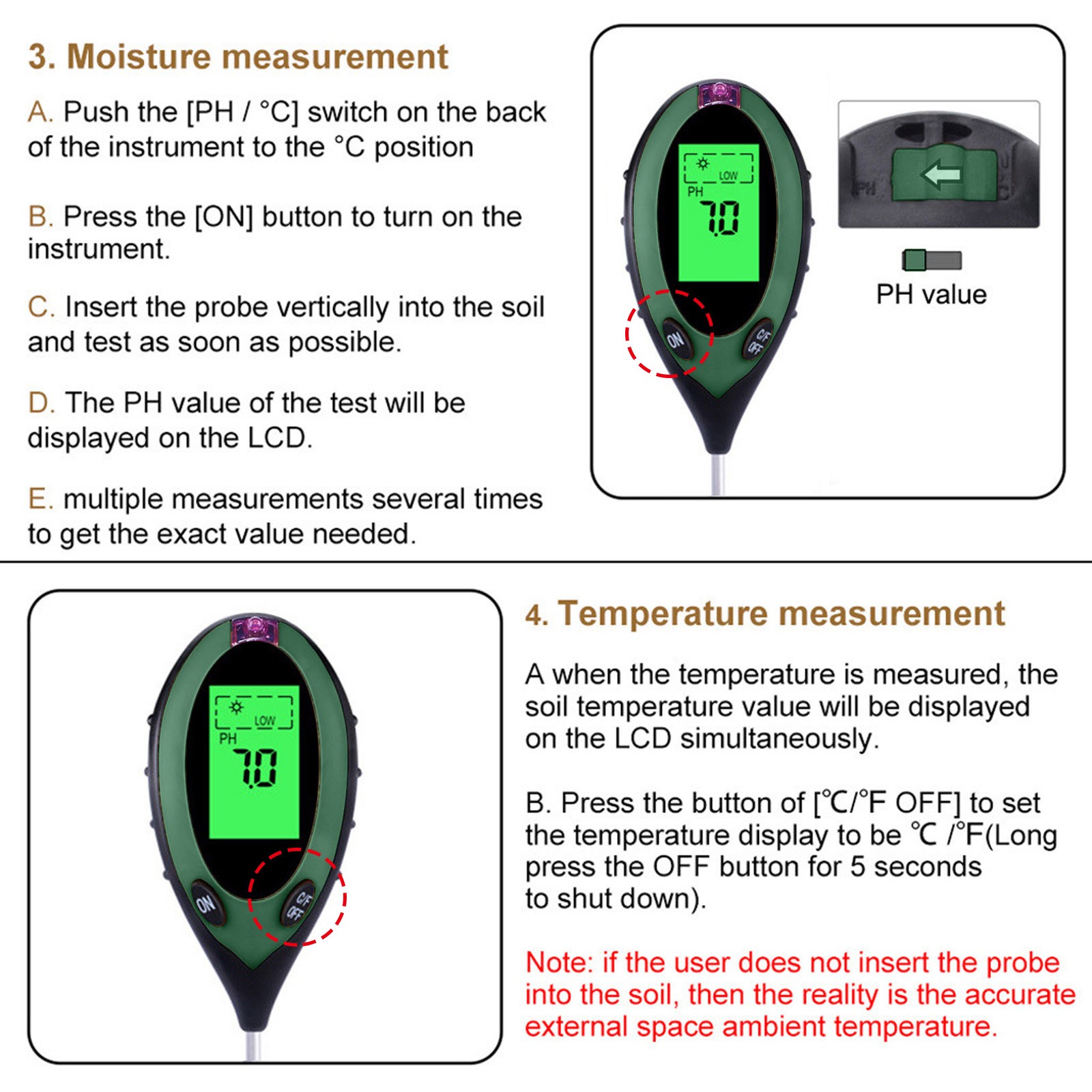 Без батареек щипцы измеряютВлажностьИ pH содержание почвы от уровня корня и определить, идеально ли расположены ваши растения в отношении их позиционирования. ВВлажностьСчетчик Работает со всеми типами грунтов и подходит для использования в дверях или вне дверей-Просто поместите его в грунт, установите в настройки, которые вы хотите измерить и прочитать масштаб.
