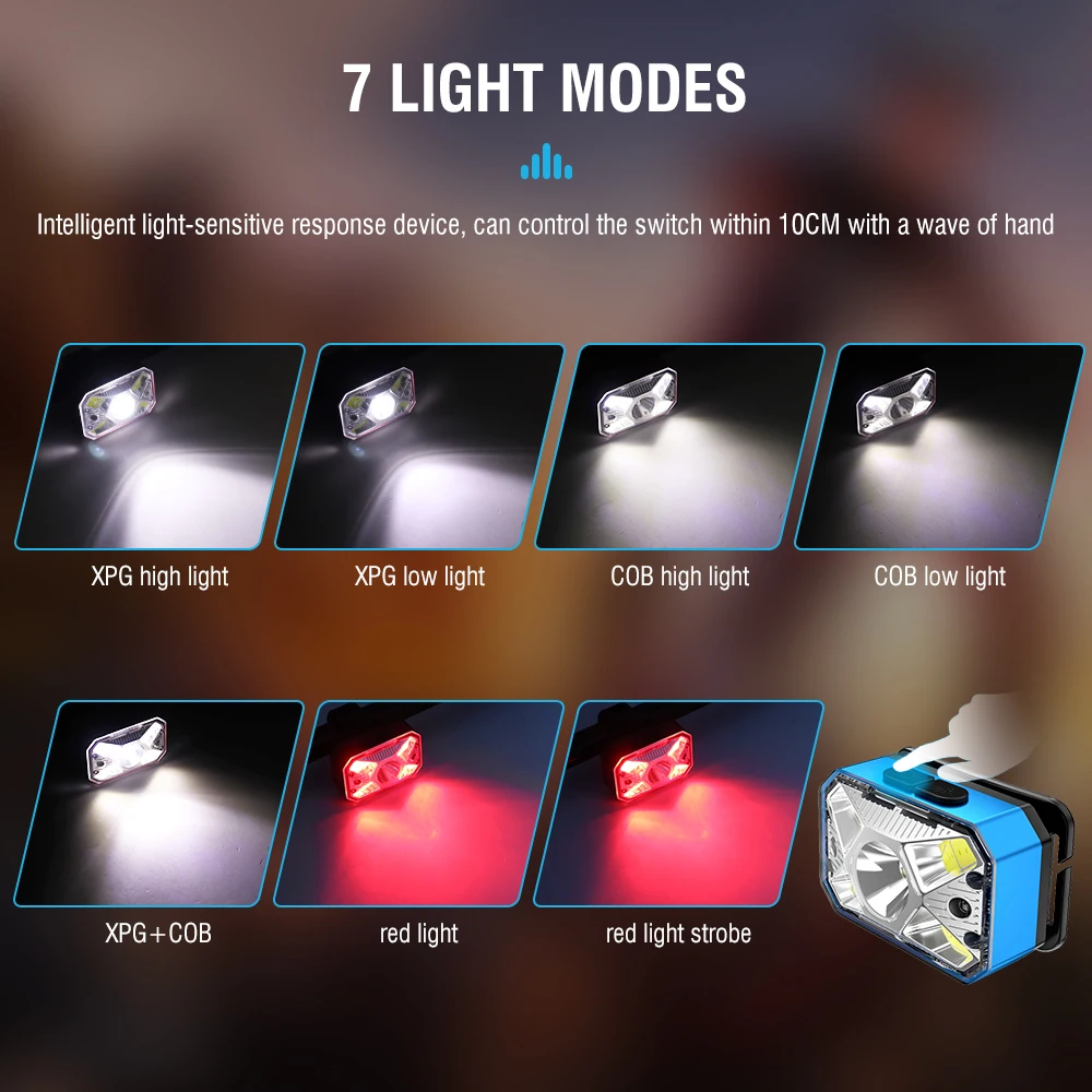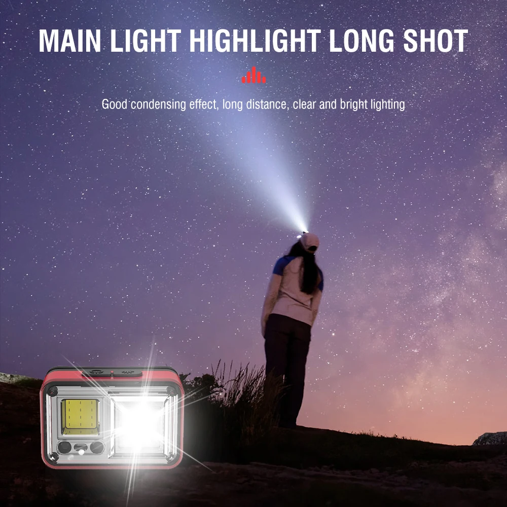 Светильник ing gear: 9 передач: Левая кнопка-главный индукционный светильник on - COB on; правая кнопка-главный светильник-наполовину яркий-COB яркий-наполовину яркий-полностью яркий-красный светильник на-красный мигающий светильник