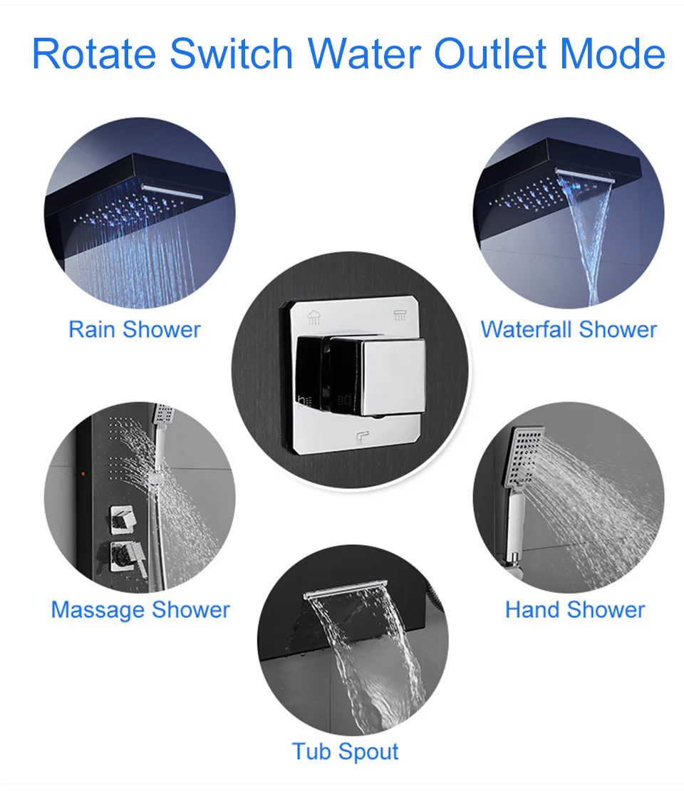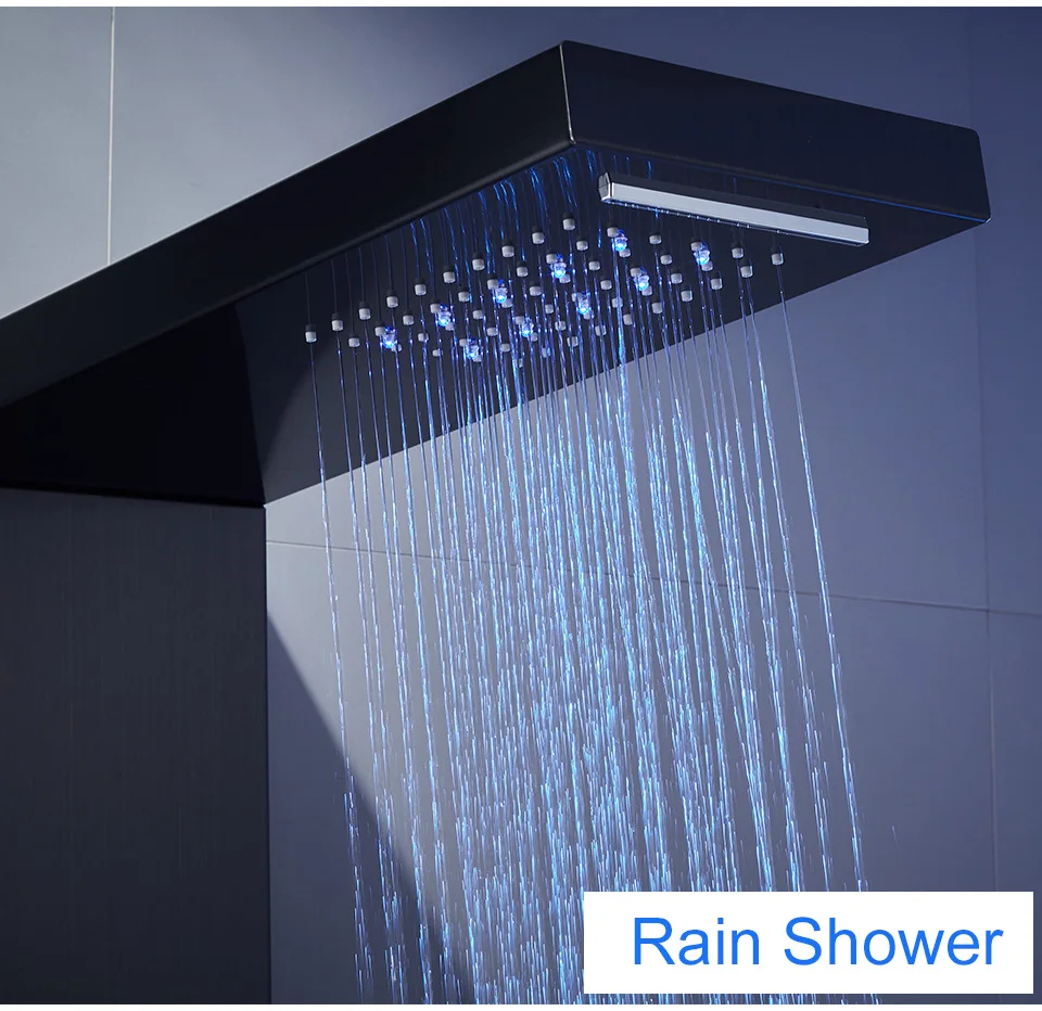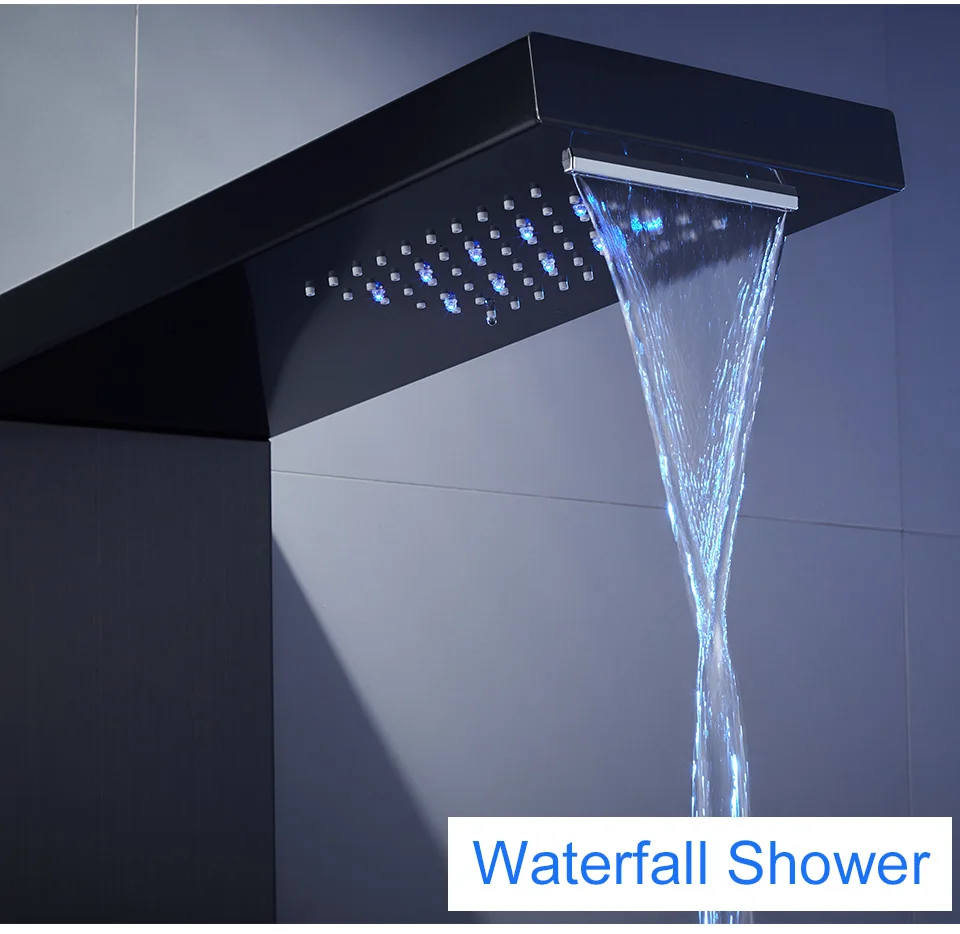 【 5 в 1 душевая панель 】элегантная душевая панель в современной черной поверхности является ловцом для глаз в каждой ванной комнате. Этот 5-в-1 Душевая система Встроенный светодиодный дождевая вода и водопад верхний душ, 3-функций насадки для душа, водопад излив на ванну, обеспечивая незабываемый опыт ливня для отдыха и приятный на ощупь. Позвольте нам запускать 2 одновременно, ключ-давление воды