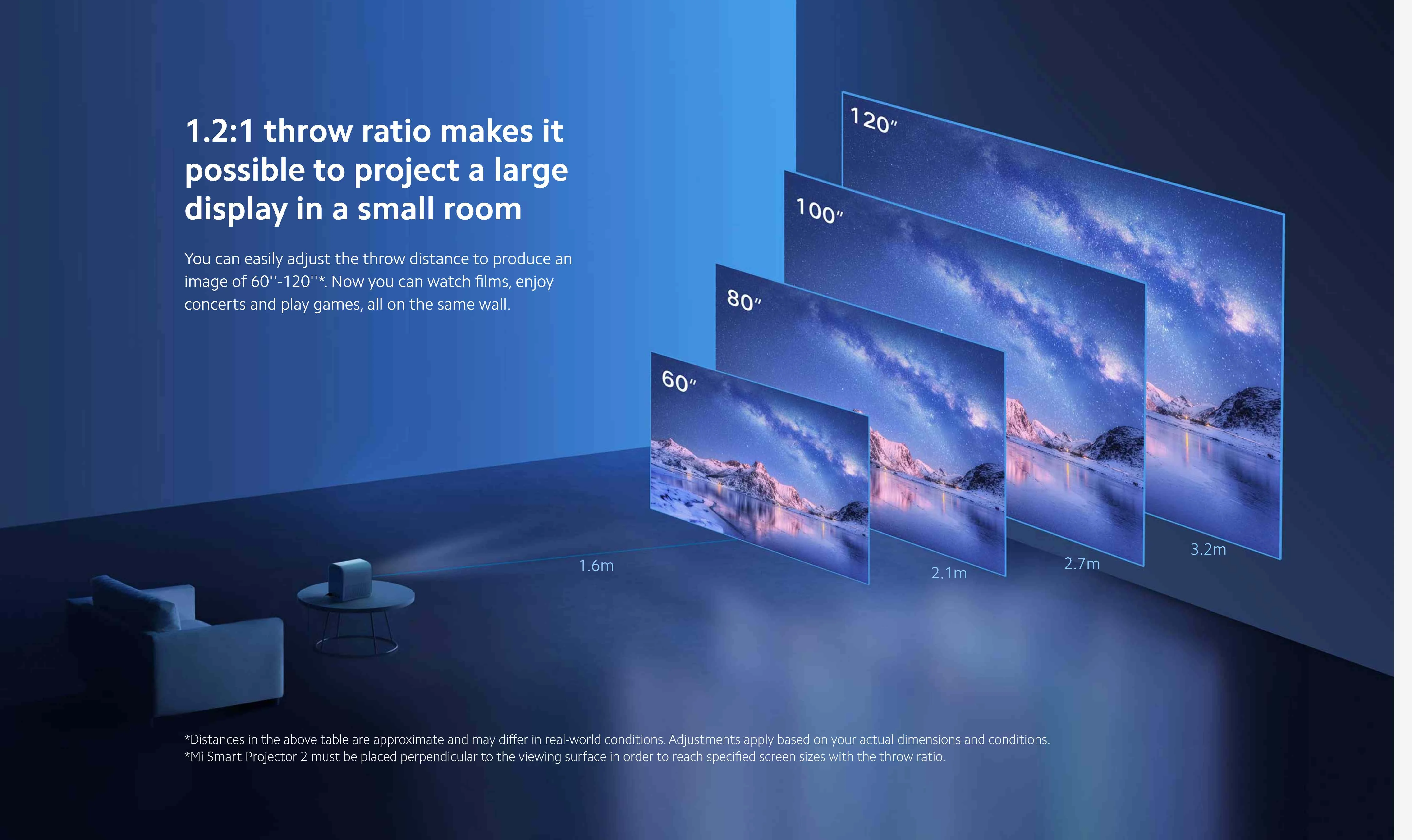 * Дисплей может быть любого размера от 60 "до 120"; Расстояние проекции и площадь вычитаются на основе теоретических приближений. Фактические данные могут незначительно отличаться.
