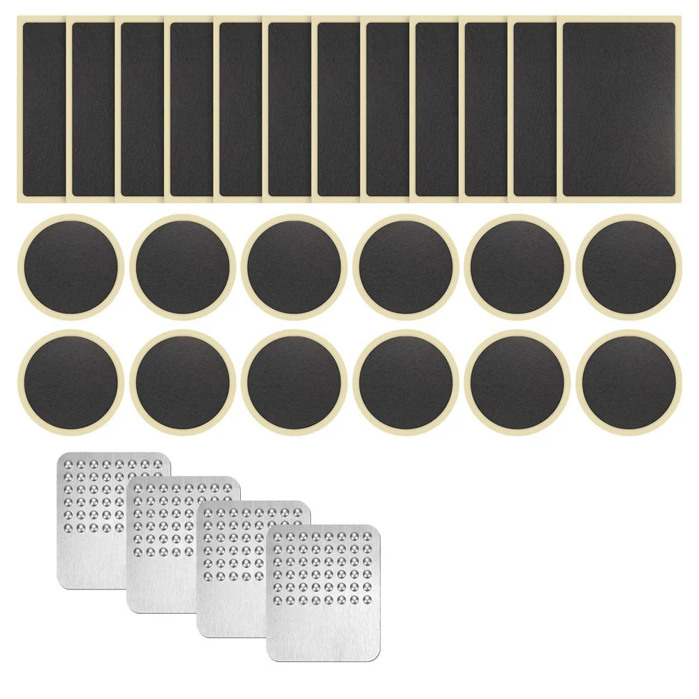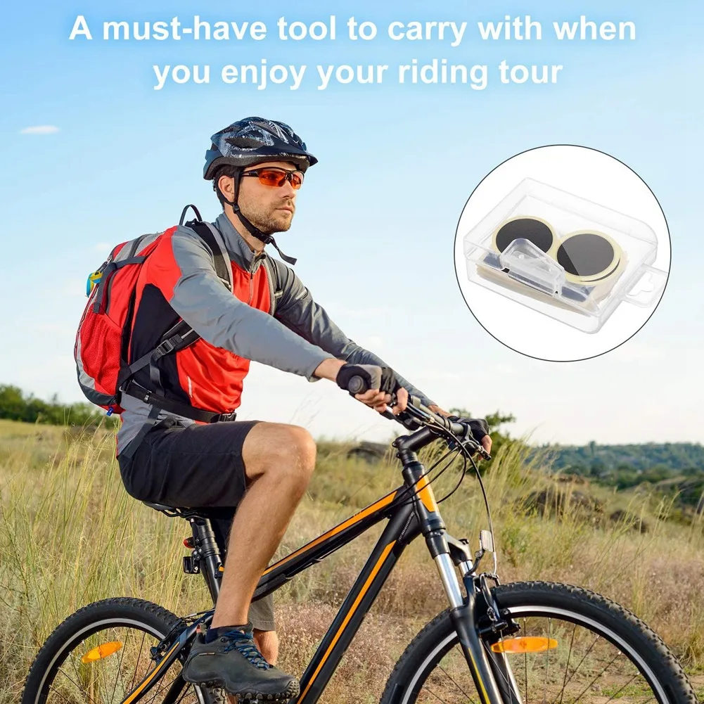 Посылка: комплект для ремонта велосипедных шин включает в себя 12 круглых пластырей без клея и 12 продолговатых пластырей, 4 металлических пластырей, всего 28 ремонтных инструментов для вас, достаточное количество позволяет использовать их удобно в любое время