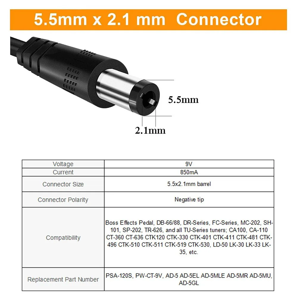 Цилиндрический соединитель: 5,5 мм x 2,1 мм, наконечник отрицательный (-) дизайн