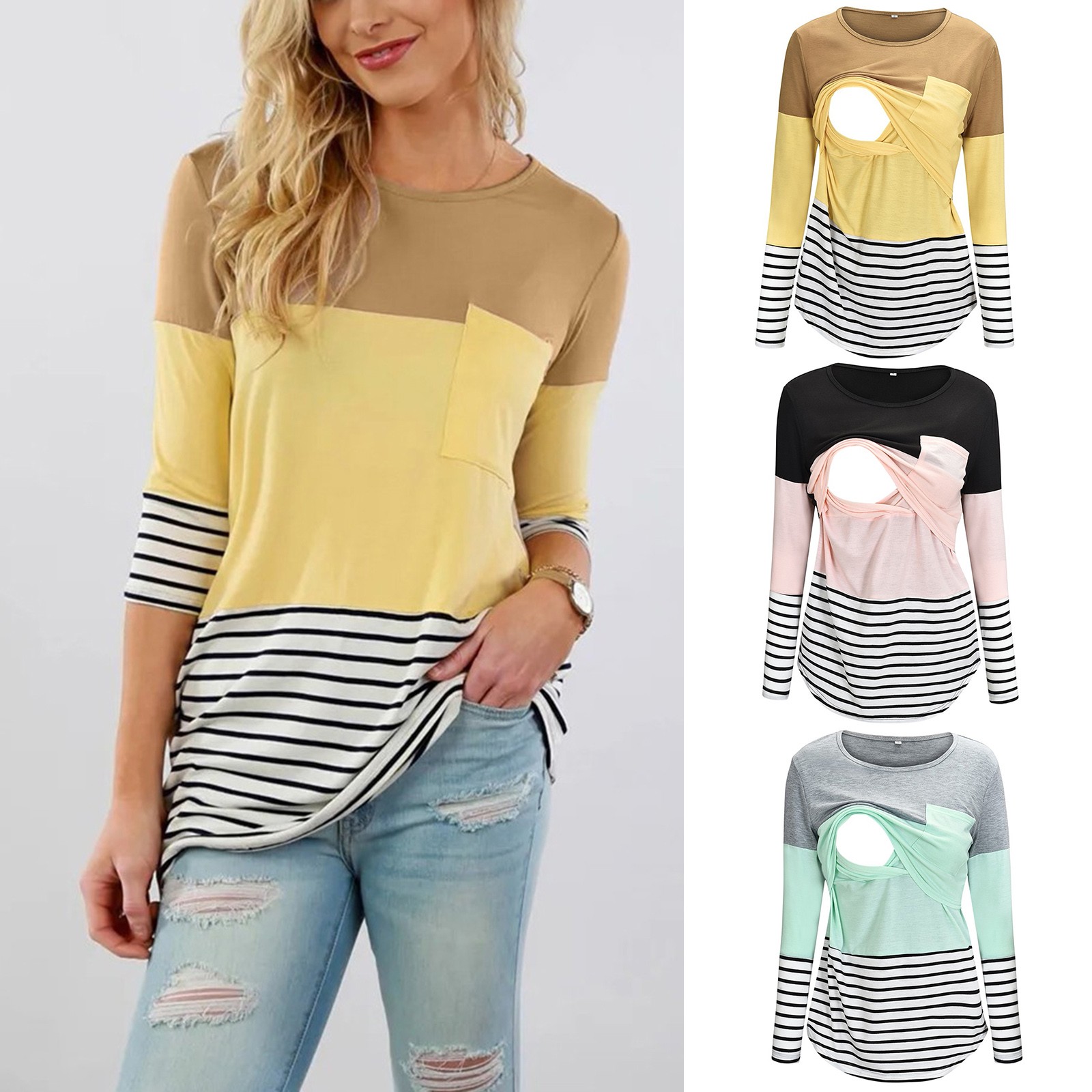 Женская футболка для кормящих мам с длинным рукавом и полосатым принтом для грудного вскармливания