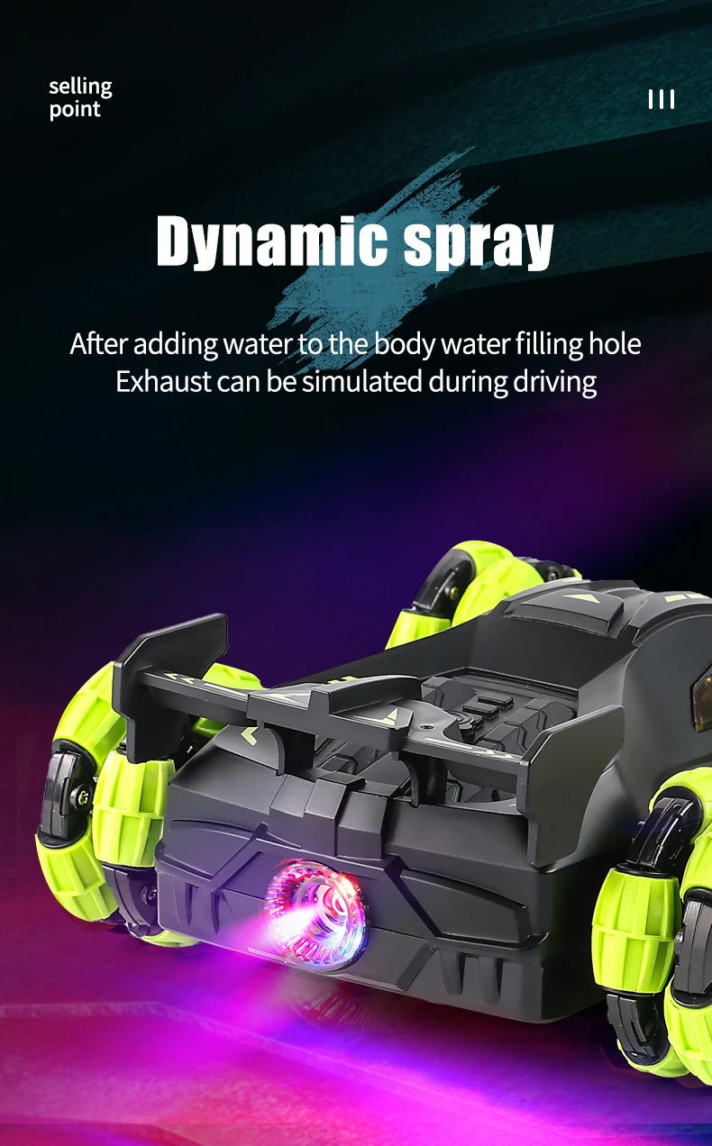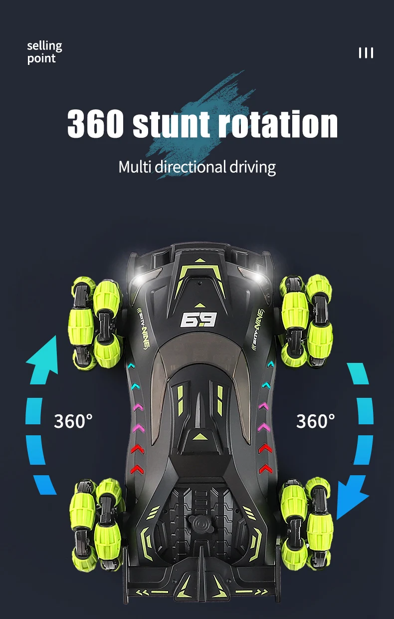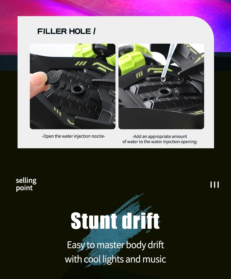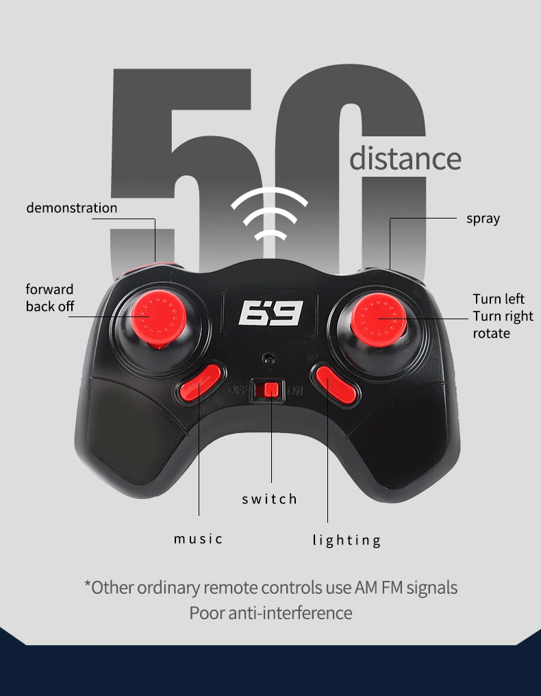 1. Функция: вперед и назад, поворот налево и поворот направо, дрейф, спрей, светильник, музыка, два режима управления (дистанционное управление/часы гравитационный датчик дистанционного управления)
