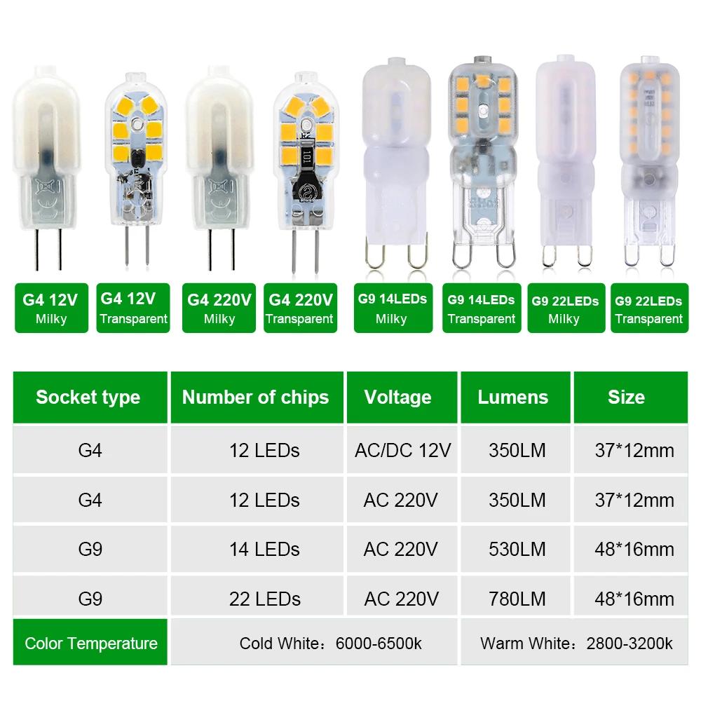 Простая установка: Стандартная база G4 / G9, может быть легко установлена вместо обычных галогенных ламп.