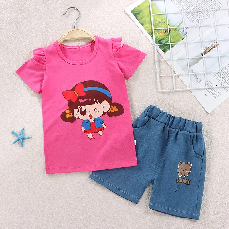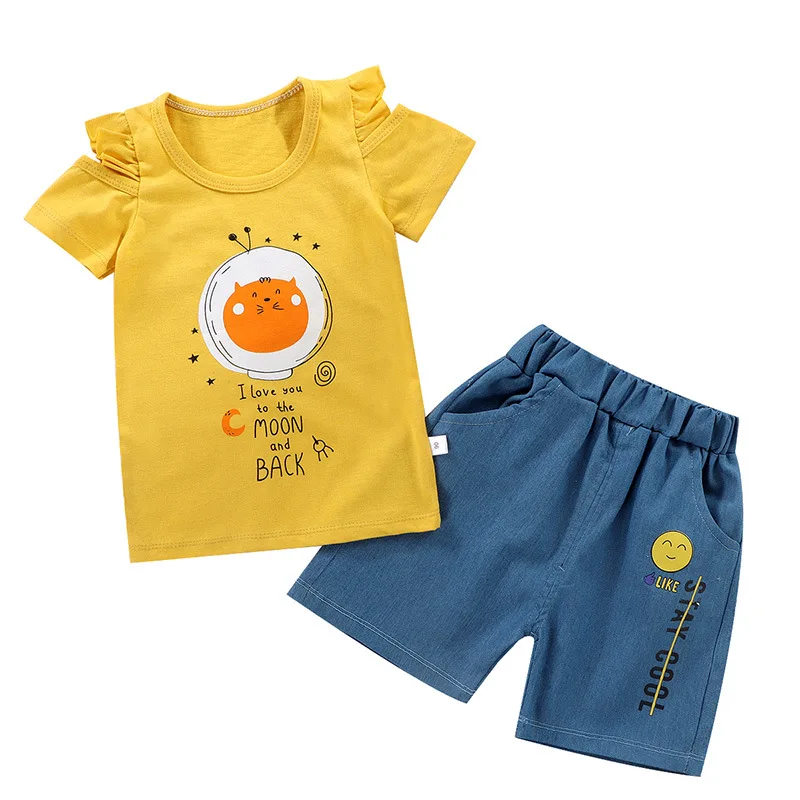 LZH/2023 летние комплекты одежды для маленьких девочек одежда для детей Футболка с рукавами-крылышками + джинсовые шорты комплект из 2 предметов повседневная детская одежда