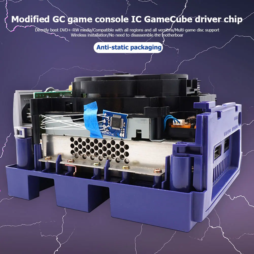 Это drivechip для Nintendo GameCube. Он устанавливается непосредственно на логическую панель оптического привода и впрыскивает патч-код в привод во время работы. Это позволяет выполнять команды отладки и считывать DVD +/-R/RW. Вы можете загружать все импортные игры, резервные копии игр, также вы можете загружать оригинальные и резервные копии многодисковых игр (с версиями, которые мы продаем).