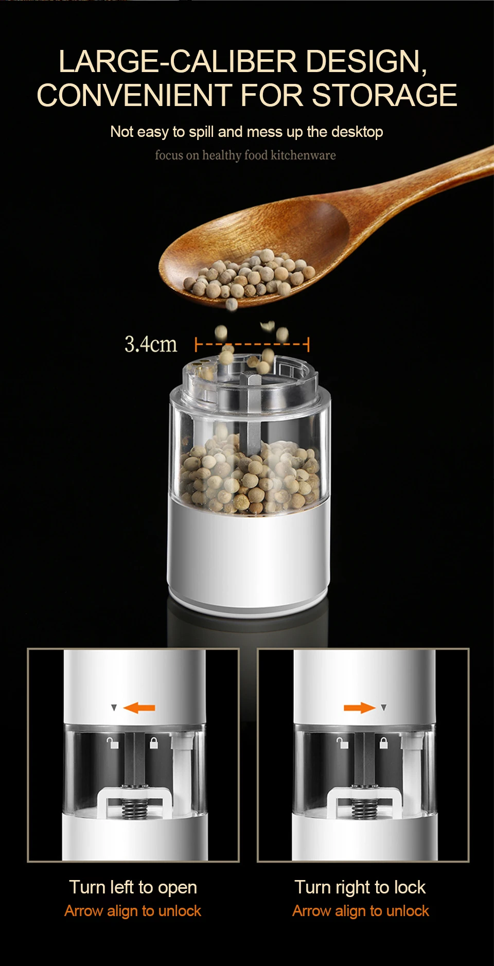 1. Материал: перцовая шлифовальная машина изготовлена из керамического бита и АБС-пластика, устойчива к ржавчине и коррозии, не влияет на вкус специй.