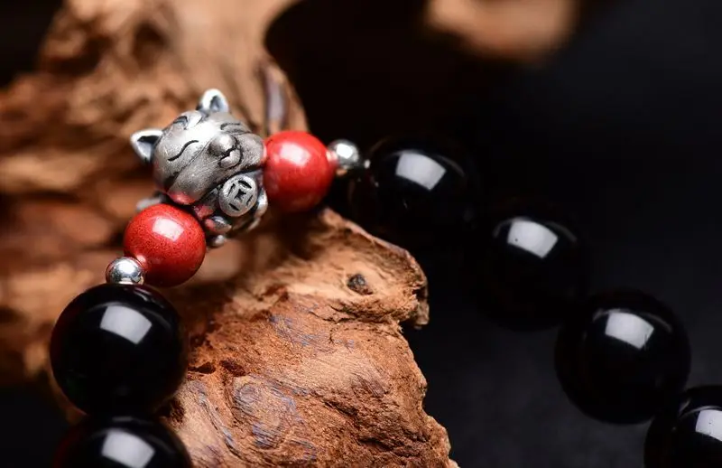 Натуральный кристалл черный обсидиан 925 серебряный браслет в виде лисы буддийский браслет с молитвами Браслеты DIY Прямая поставка Jewelr