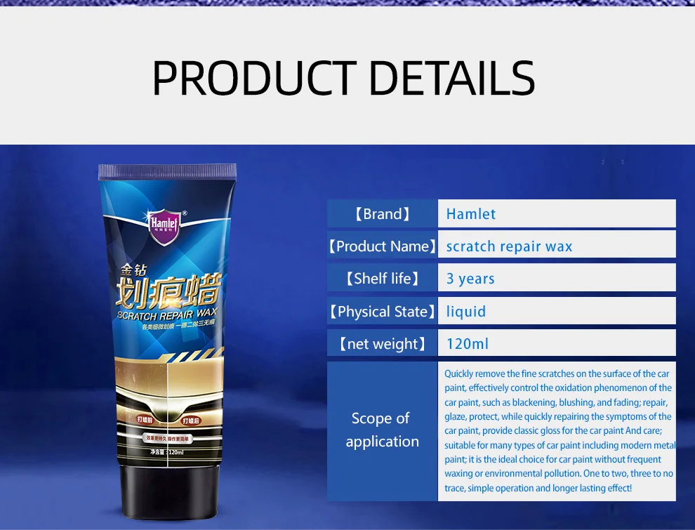 Принцип ремонта: воск для устранения царапин содержит умеренные абразивные частицы. Абразивные частицы протирают Верхние два слоя краски, чтобы постепенно сгладить и заполнить, так что царапины исчезают; Абразивные частицы Гамлета отличаются от обычных абразивов на рынке, И добиться длительного ремонта царапин, не повреждая эффект краски;