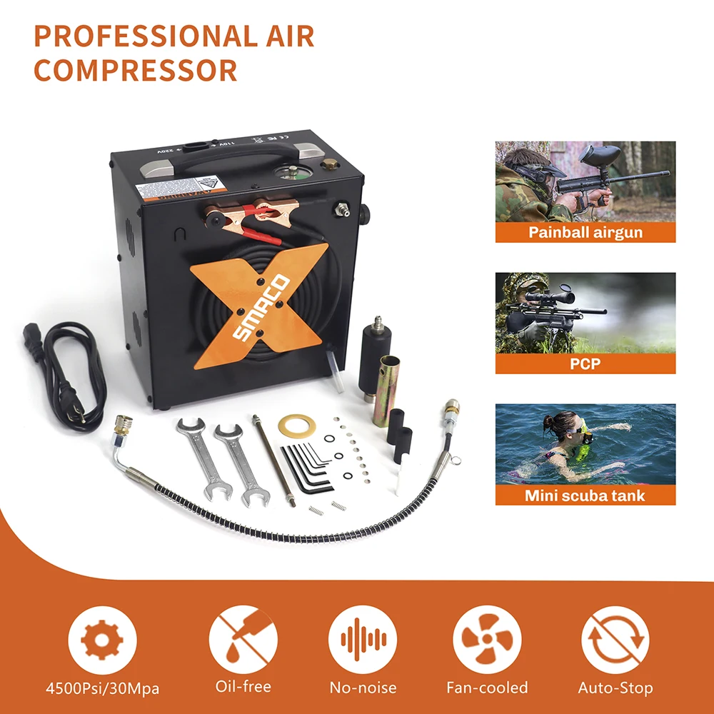☆Установка значения автостопа и встроенного фильтра масляной воды для дыхания воздуха: заполнение винтовки или пистолета без проблем с автоматическим отключением, которое пользователь устанавливает при желаемом давлении. Это избавляет пользователя от необходимости наблюдать за манометром заполнения, так как компрессор выполняет свою работу. Он также оснащен фильтром влажности, который будет более безопасным. С быстроразъемом 8 мм вы также можете надуть бутылку для дайвинга менее 1,5л (не включает адаптеры для Акваланга, гайка на выходе компрессора M10 * 1 ).