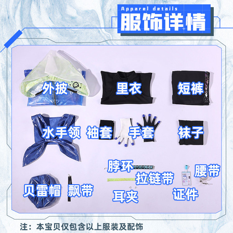 Товар включен на рисунке ниже: плащ + подкладка + шорты + матросский воротник + рукава + перчатки + носки + берет + стример + ремень + сертификат + ремень на молнии (за исключением: парик и обувь).