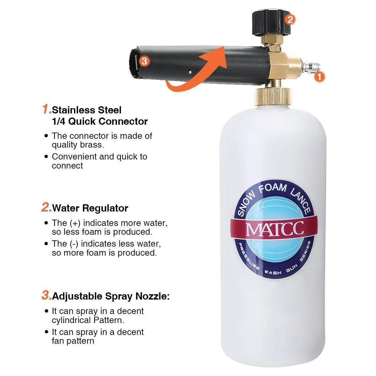 【 5 насадка для мойки: удовлетворяйте ваши потребности в различных ситуациях, таких как полив цветов и растений, мытье автомобиля или мотоцикла, домашняя чистка. И ② Регулировка набора распылителя для любой ситуации: верхний циферблат предназначен для дозирования пены и сопло регулирует шаблон распыления (широкий до узкий).