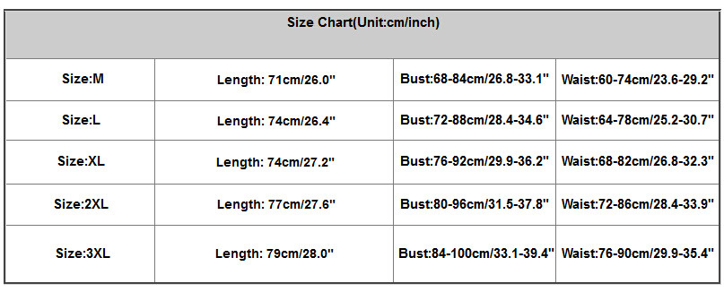 Таблица размеров (единица измерения: см/дюйм)Размер: M Длина: 71 см/26,0" Бюст: 68-84 см/26,8-33,1" Талия: 60-74 см/23,6-29,2" Размер: L Длина: 74 см/26,4" Бюст: 72-88 см/28,4-34,6" Талия: 64-78 см/25,2-30,7 дюйма Размер: XL Длина: 74 см/27,2" Бюст: 76-92 см/29,9-36,2" Талия: 68-82 см/26,8-32,3 дюйма Размер: 2XL Длина: 77 см/27,6" Бюст: 80-96 см/31,5-37,8" Талия: 72-86 см/28,4-33,9"