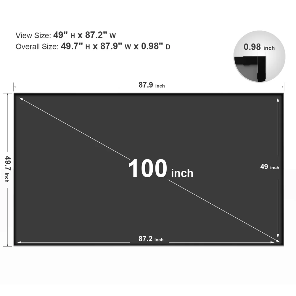 <Улучшите свой визуальный опыт>: Диагональ 100 дюймов, размер обзора 49 дюймов H x 87,2 дюйма W, 16:9 соотношение сторон HD с фиксированной алюминиевой рамкой премиум-класса. В целом в собранном виде Размеры: 49,8-дюймовый H x 88 дюймов (Ш) x 0,98 дюйма D.