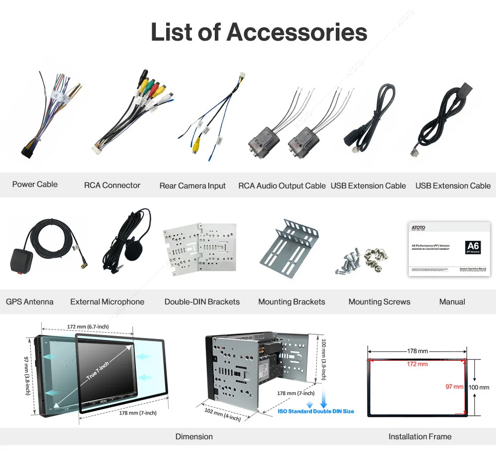 Большинство поставщиков монтажной рамы приборной панели из Северной Америки могут обеспечить двойную монтажную раму DIN с отверстием 172 мм * 97 мм (набор Metra dash, набор PAC dash и т. д.). ATOTO является первым, чтобы положить Android 7-дюймовый автомобильный стерео с минимальным количеством 172 мм * 97 мм Размер передней панели. Дополнительный адаптер рамы также включен в посылка, чтобы расширить его размер до 178 мм * 101,5 мм;