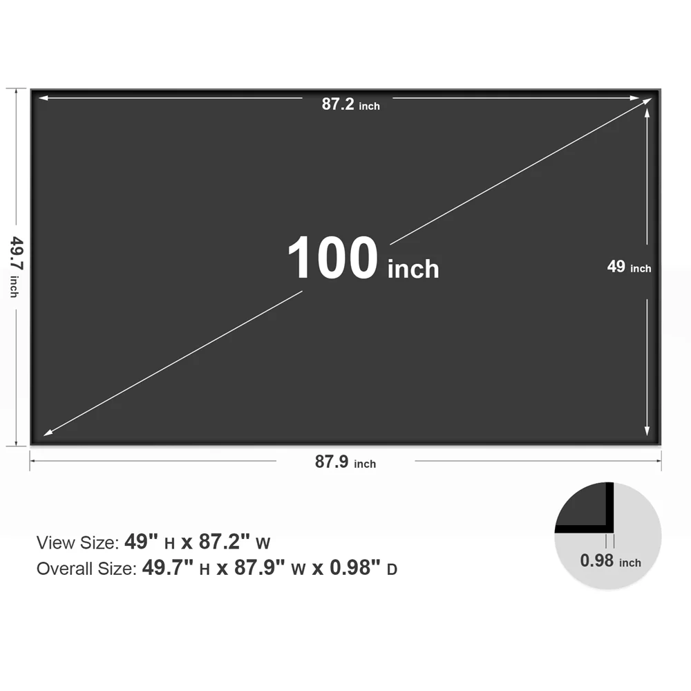 <100 дюйма по диагонали, 16: 9 соотношение сторон>: Размер обзора: 49 "H x 87,2" W. Общий размер: 49,7 "H x 87,9" W x 0,98 "D. Элегантный дизайн без кромок увеличивает ваш опыт просмотра с его нулевым краем.